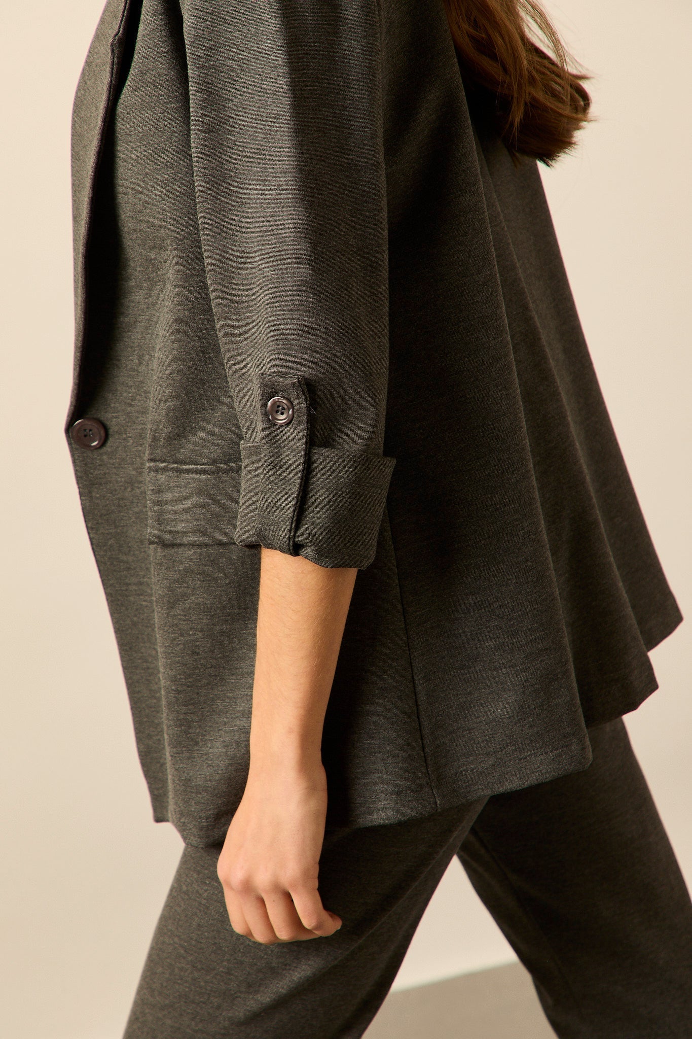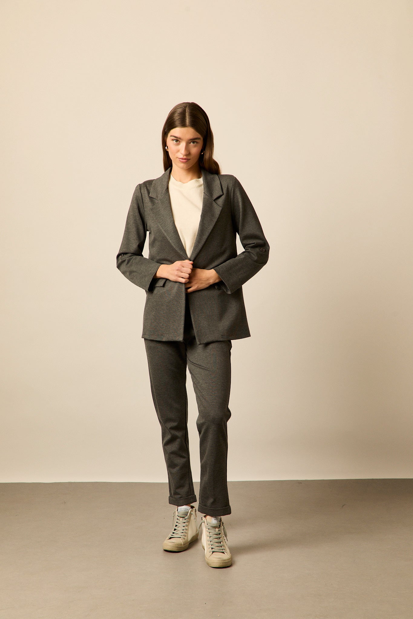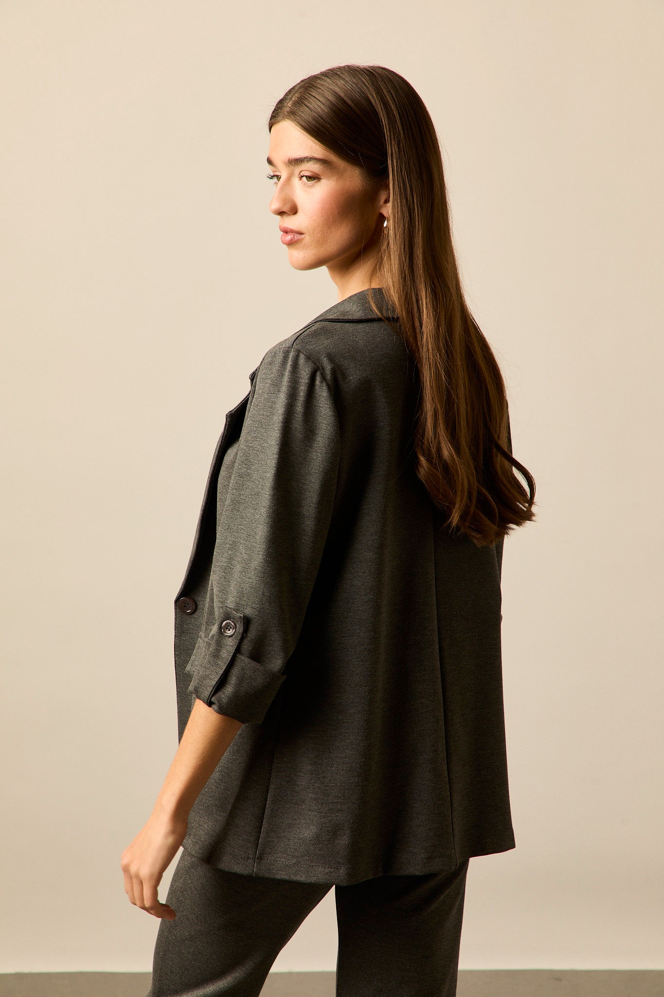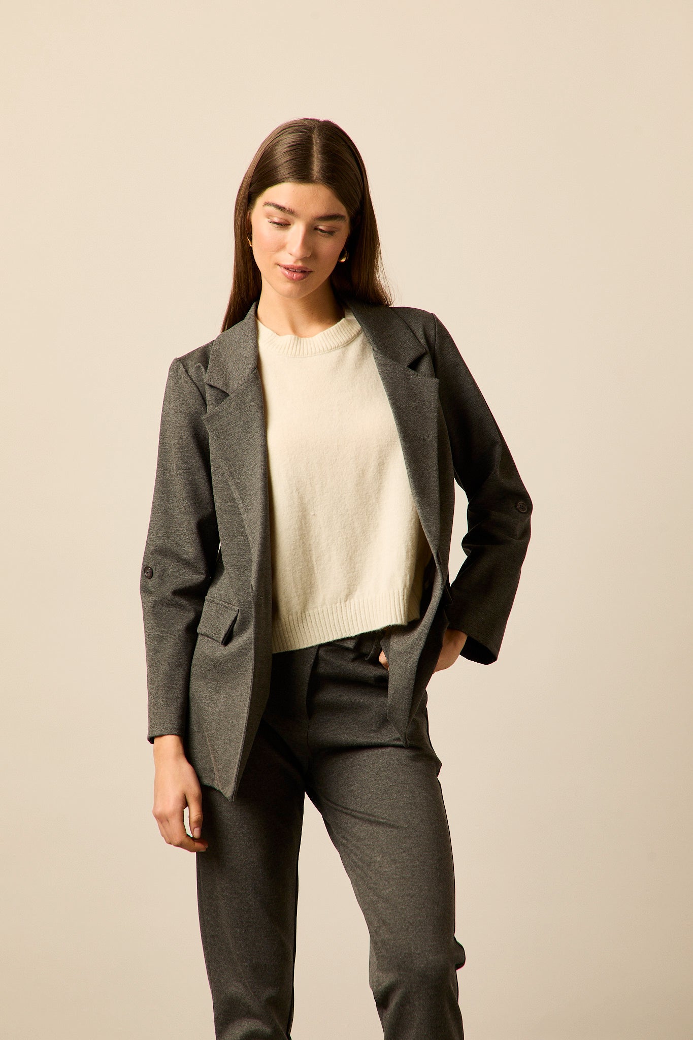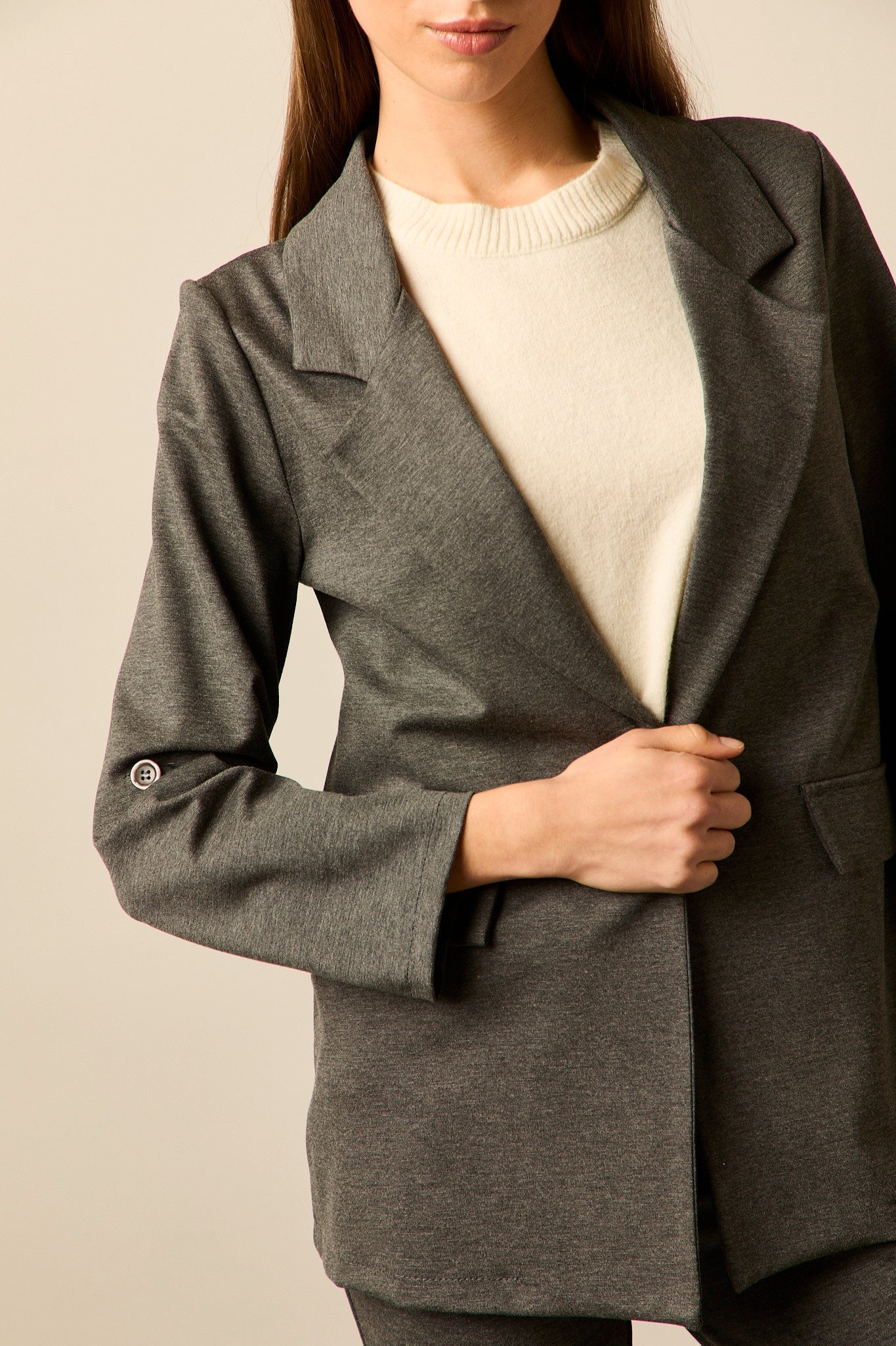 Blazer sastre en color gris. Cuello de solapa, falsos bolsillos laterales, manga larga ajustable con botón y cierre de un botón.