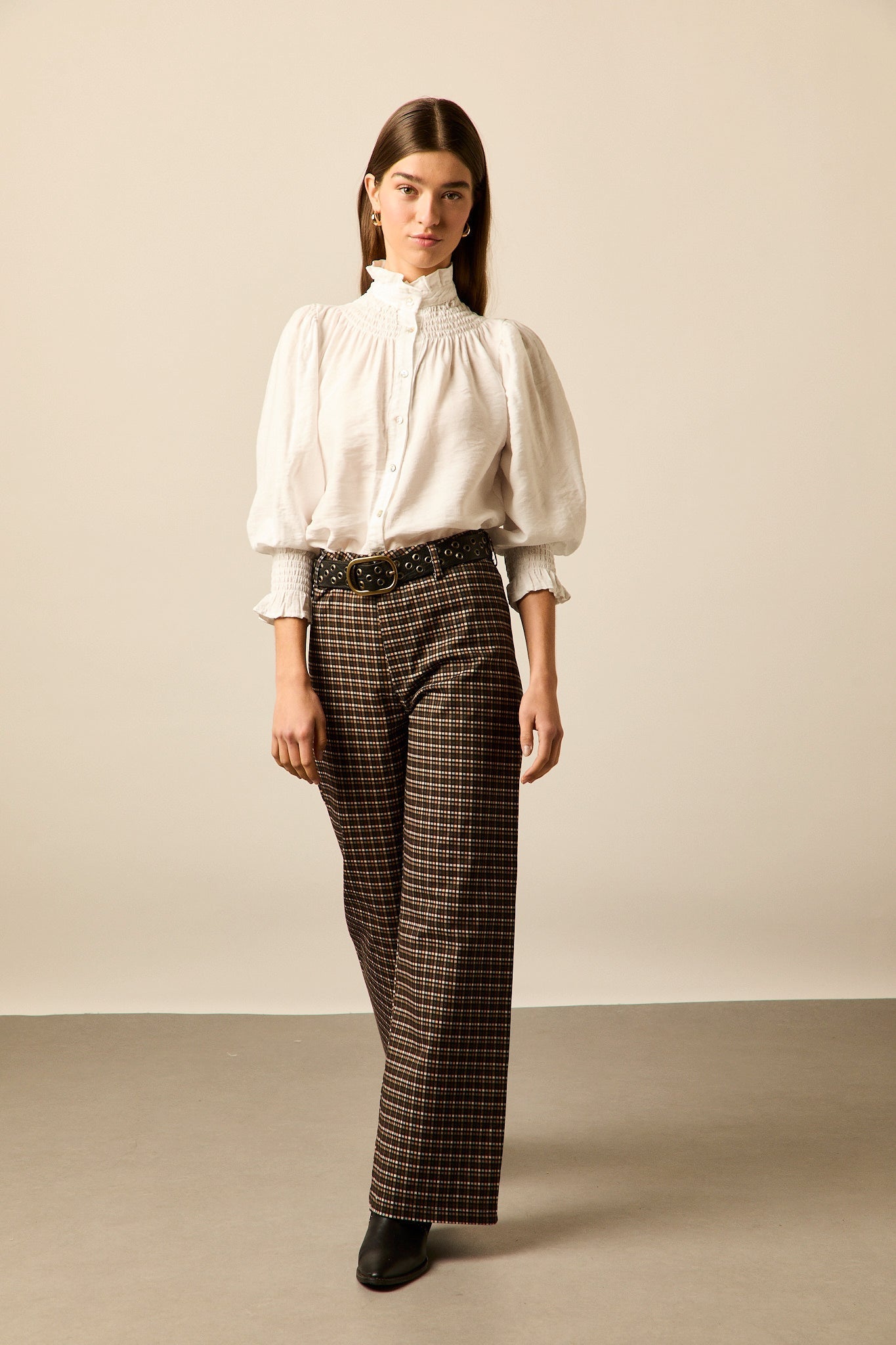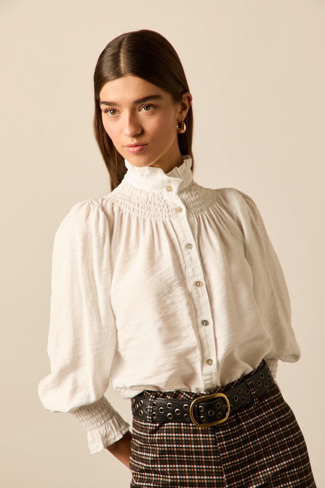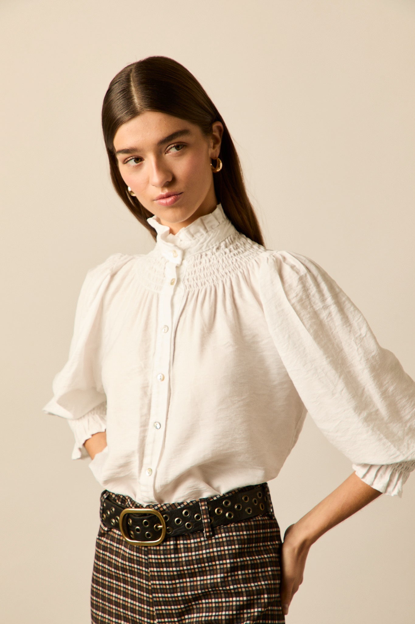 Blusa romántica en color blanco. Cuello alto, manga 3/4 abullonada, detalle de volantes en cuello y puños y cierre frontal de botones.