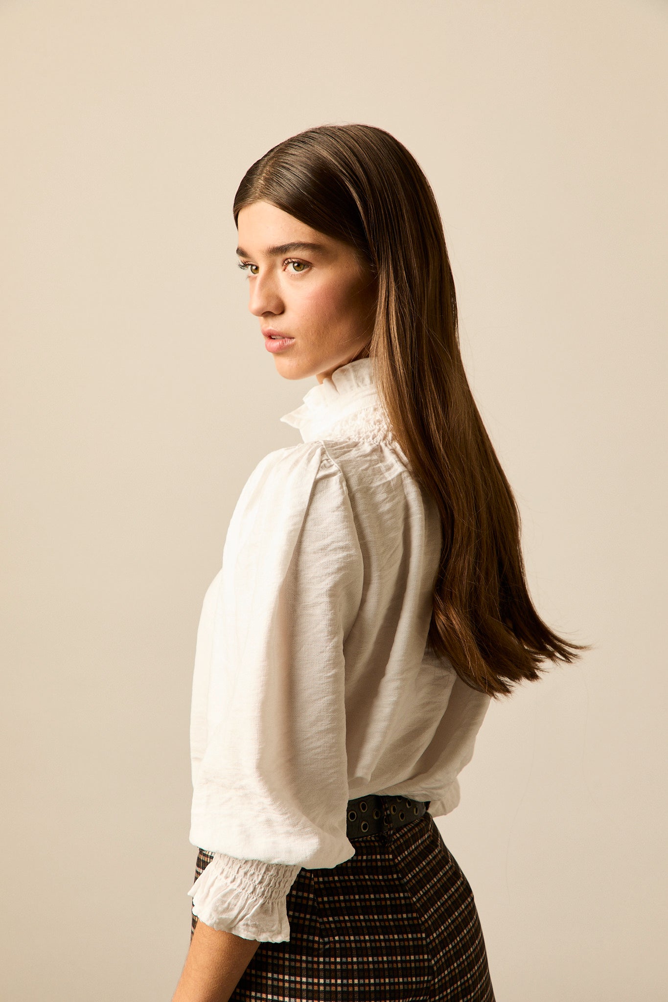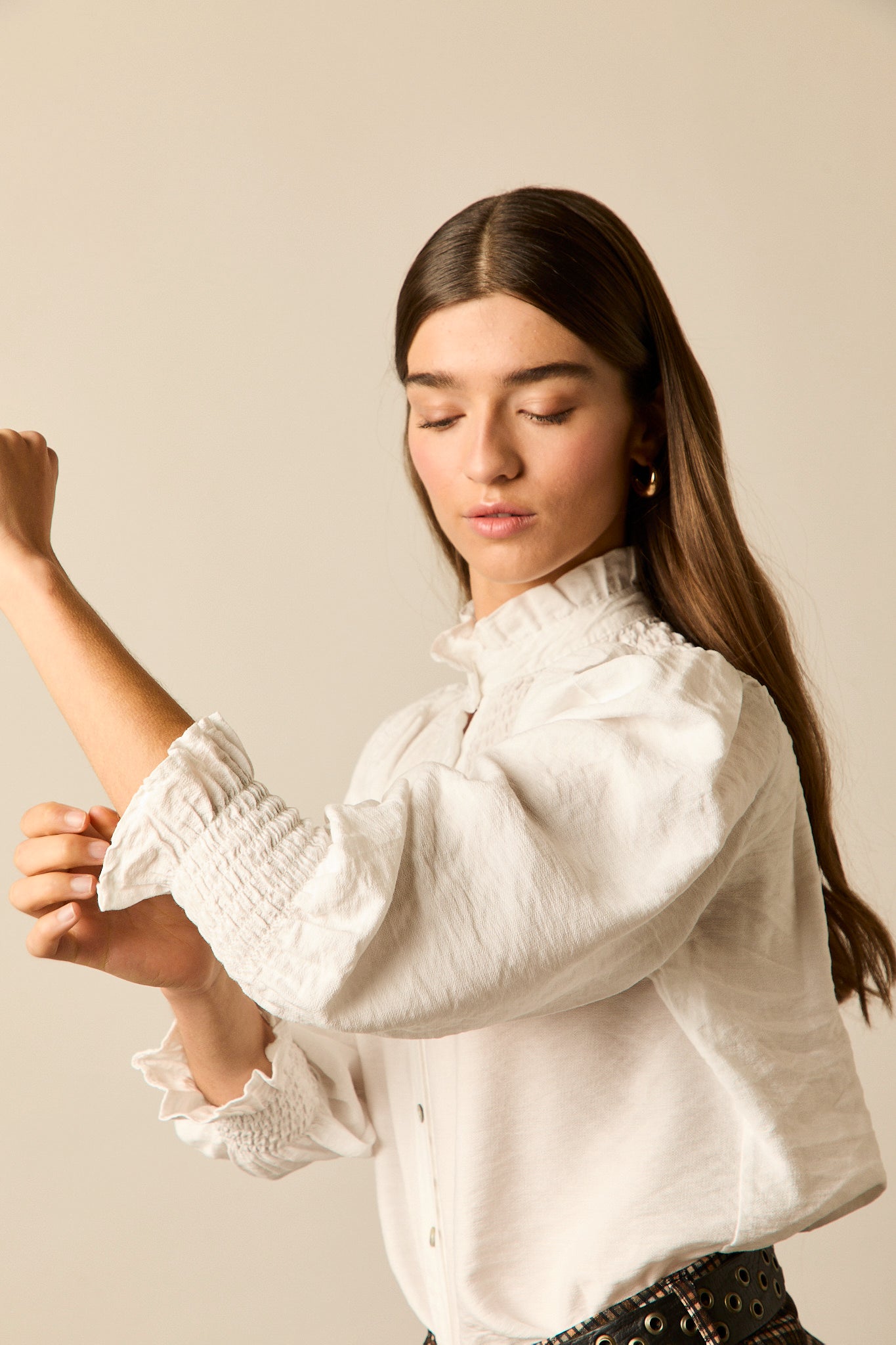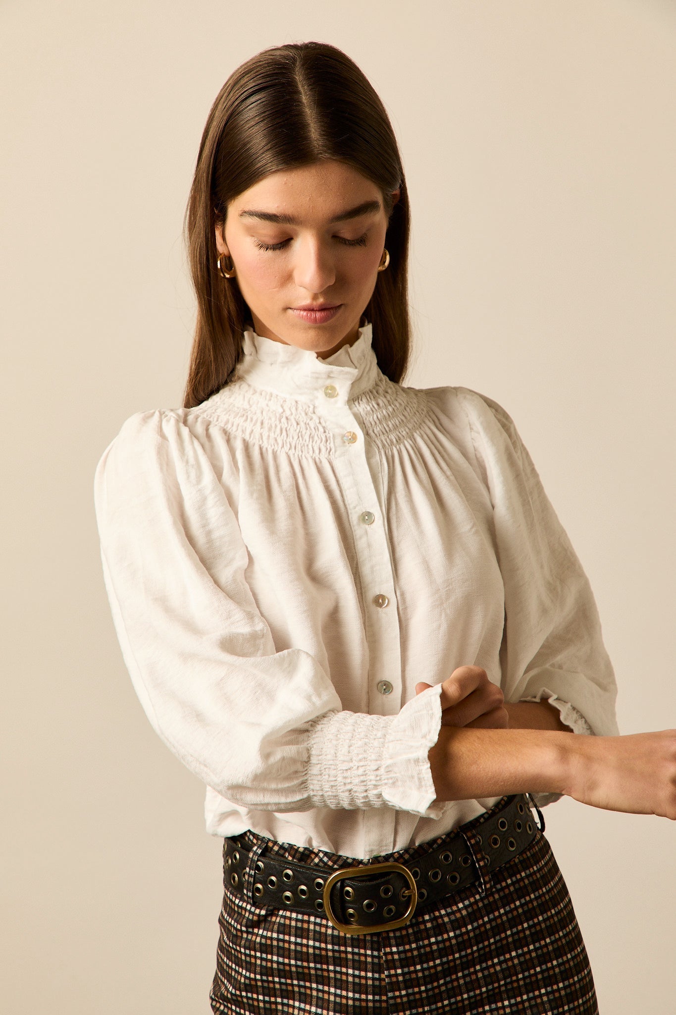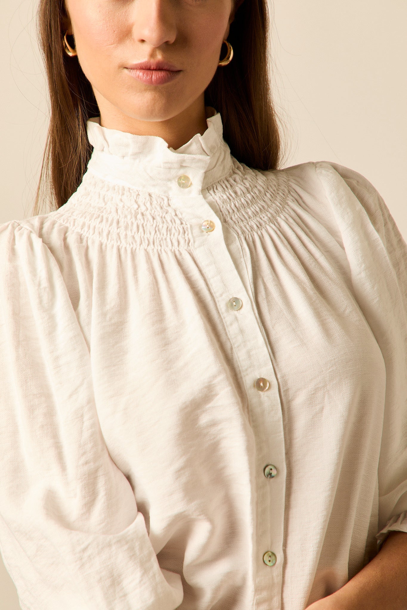 Blusa romántica en color blanco. Cuello alto, manga 3/4 abullonada, detalle de volantes en cuello y puños y cierre frontal de botones.
