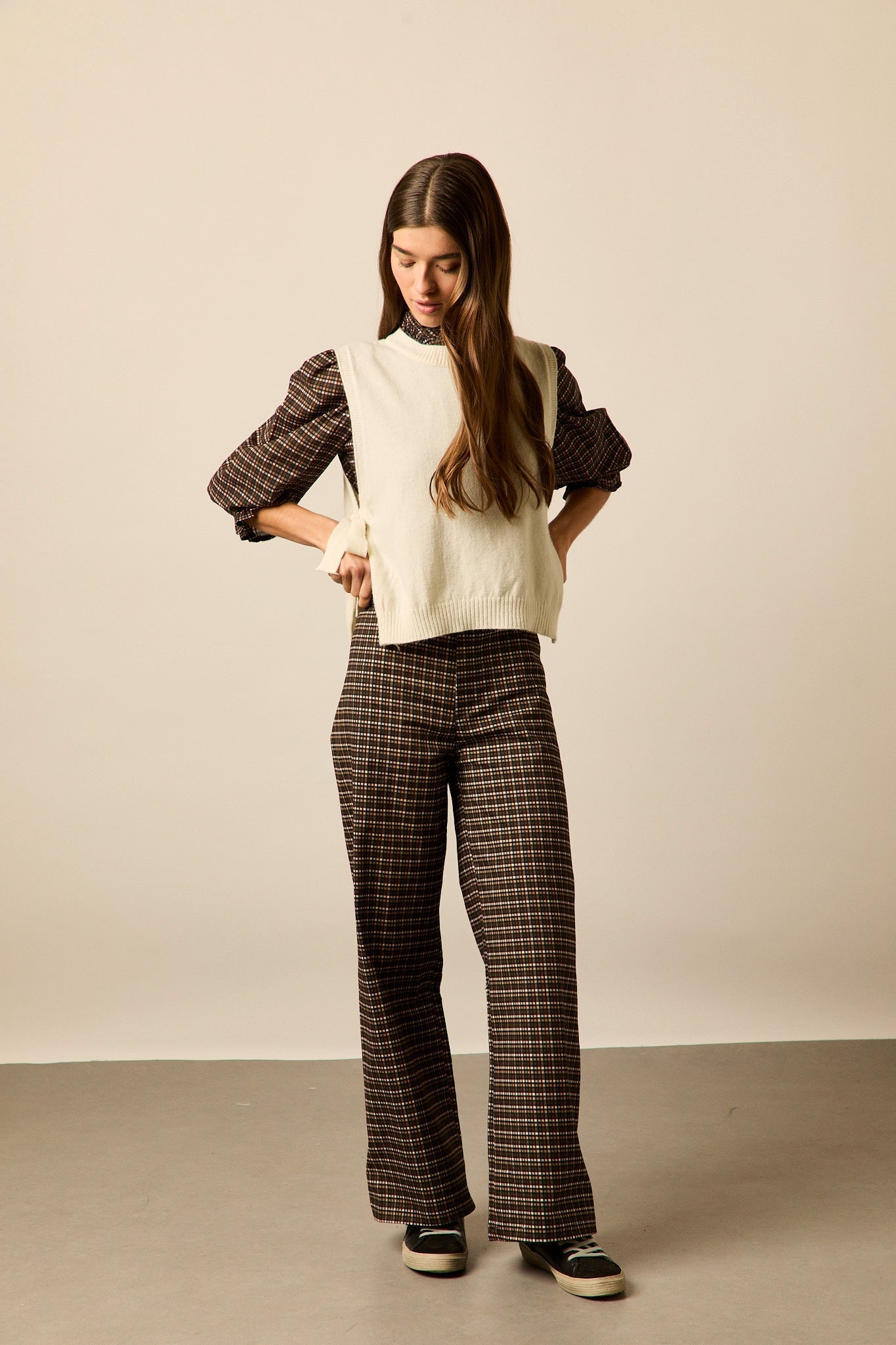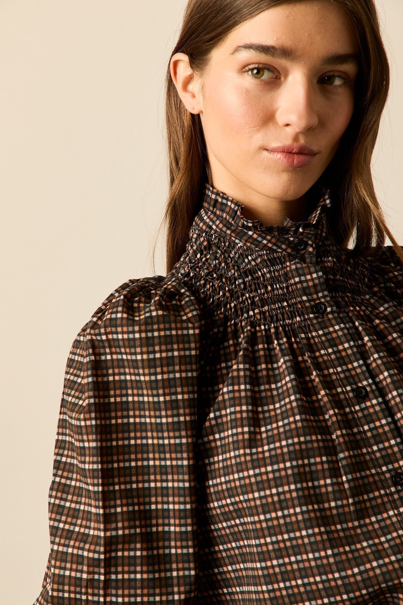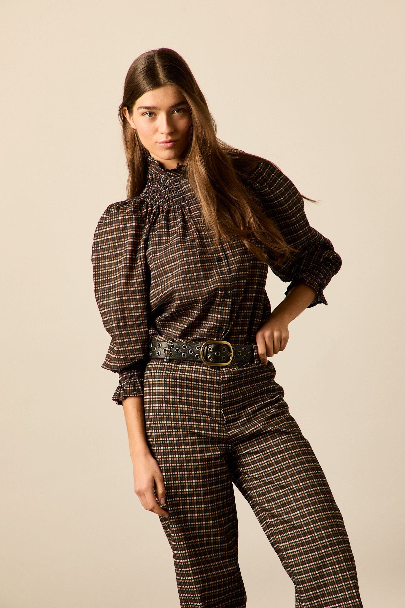 Blusa jacquard de cuadros en tonos marrones. Cuello chimenea con detalle de volantes, manga larga abullonada y cierre frontal de botones.