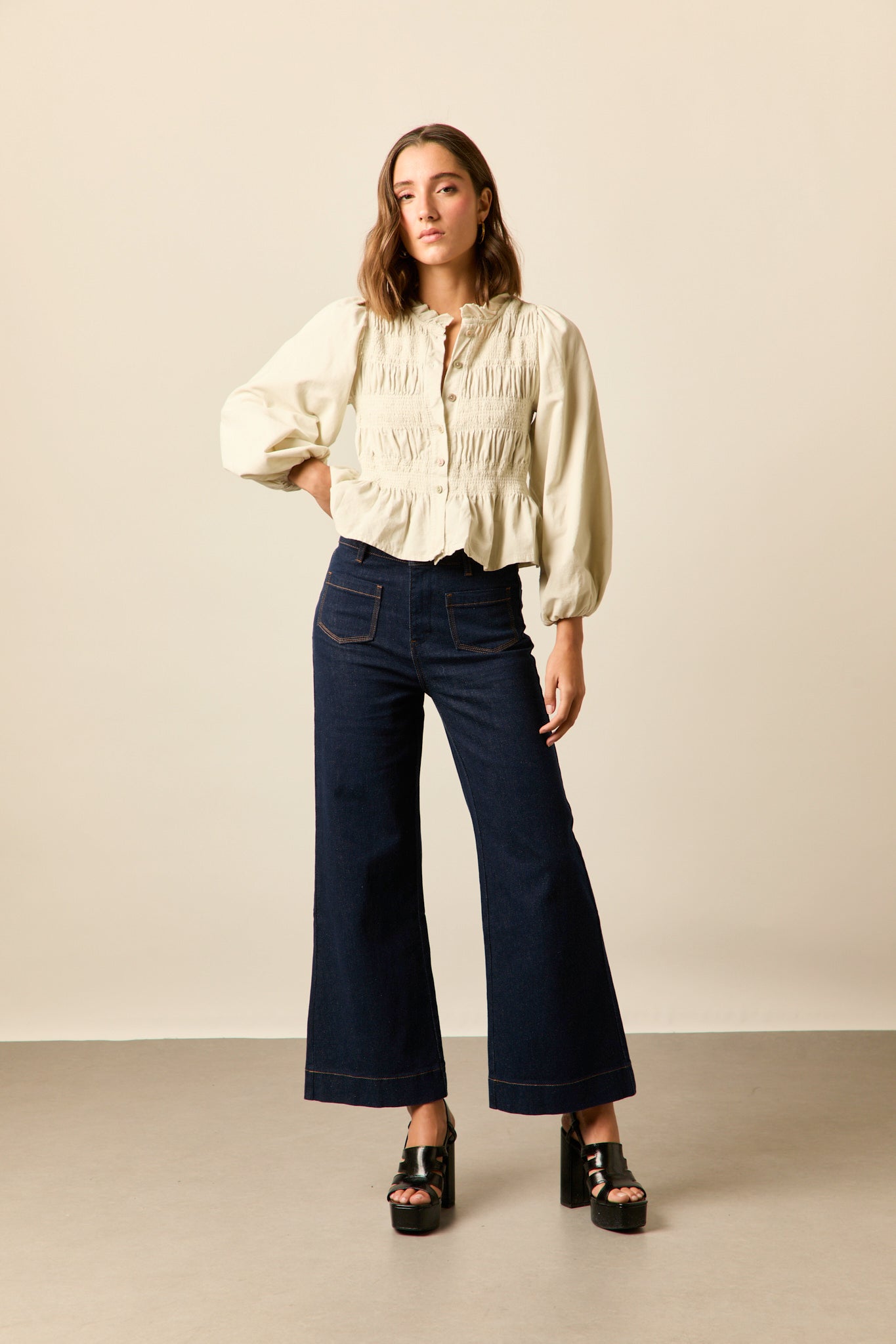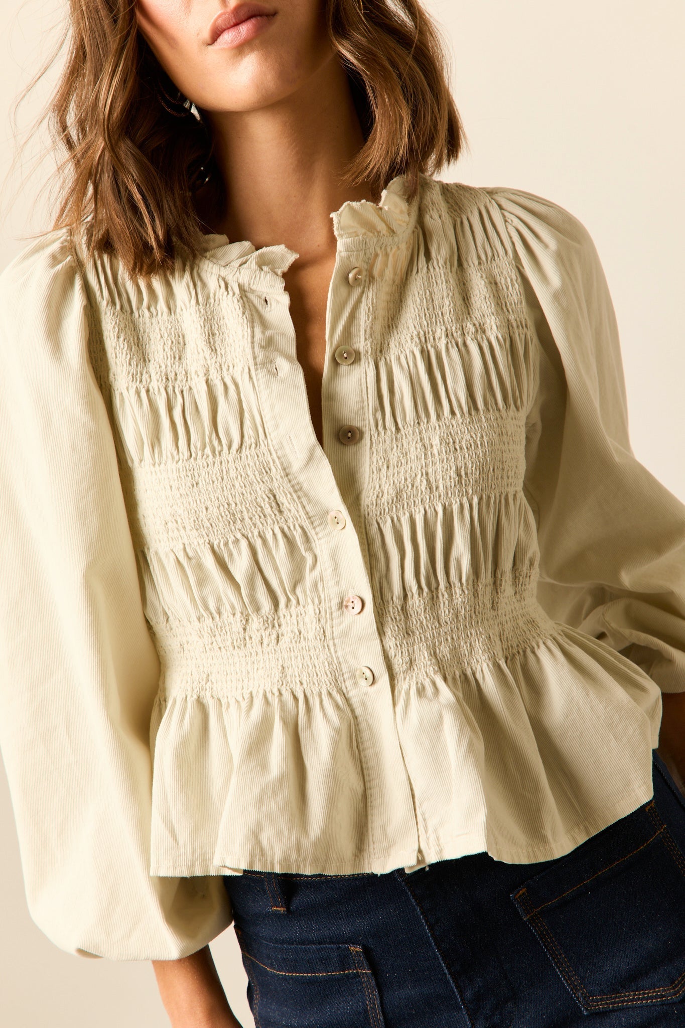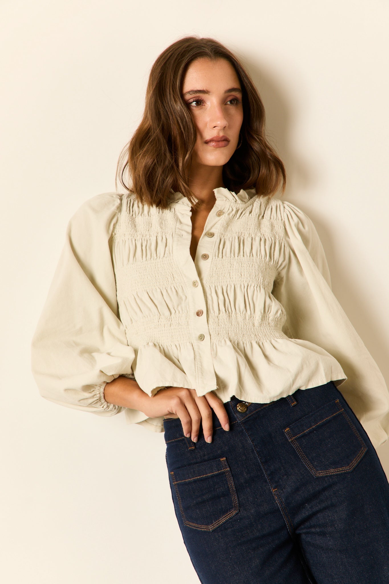Blusa de micropana en color beige. Cuello mao, manga 3/4 abullonada, pecho de nido de abeja y detalle de frunces en busto y mangas.