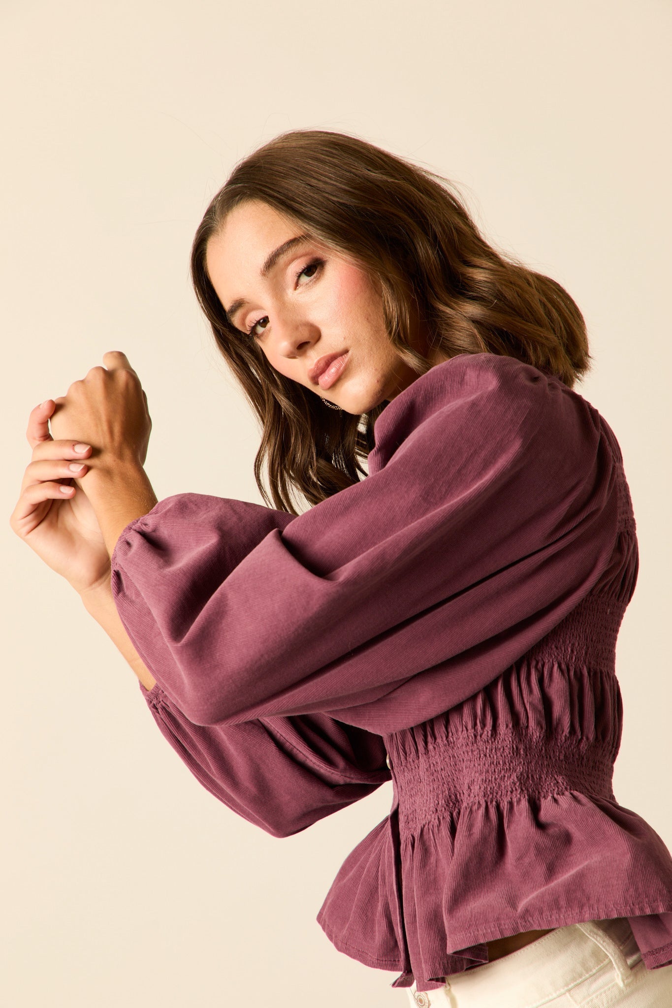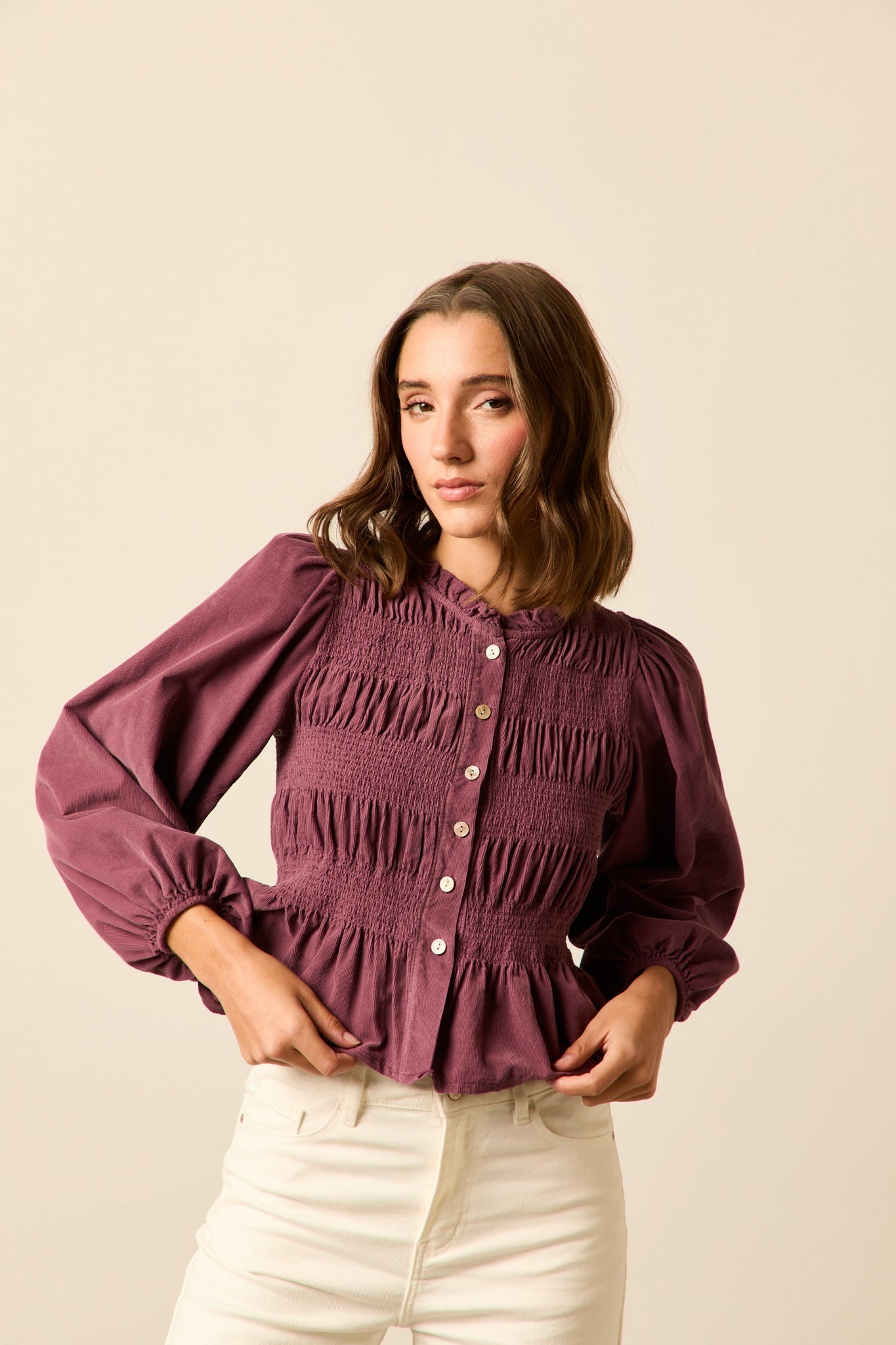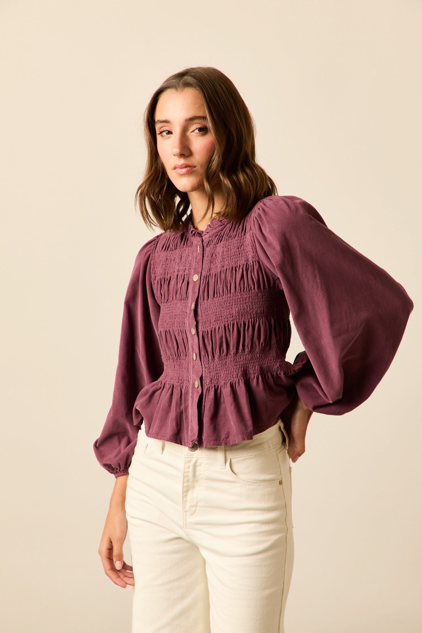 Blusa de micropana en color vino. Cuello mao, manga 3/4 abullonada, pecho de nido de abeja y detalle de frunces en busto y mangas.