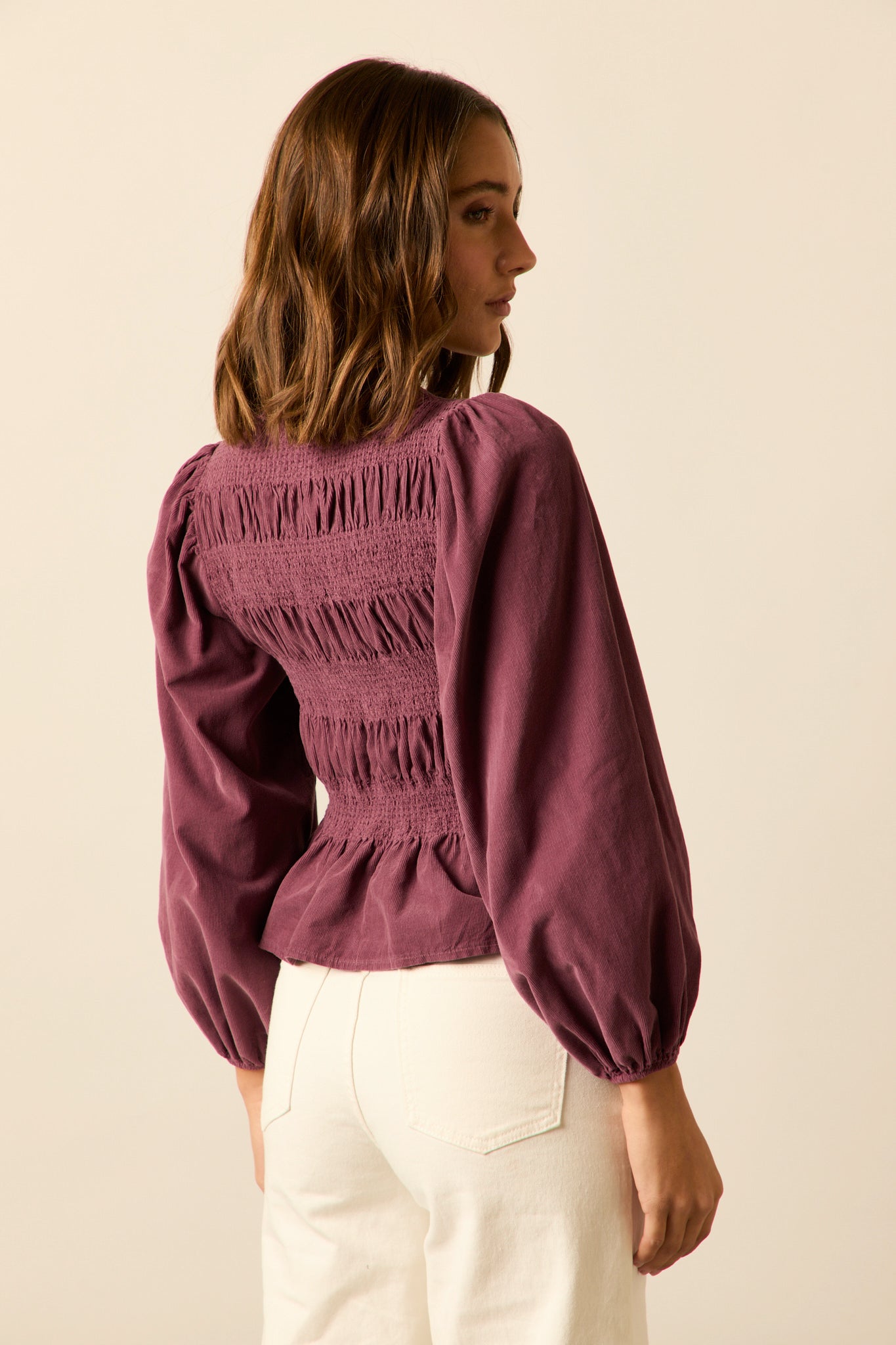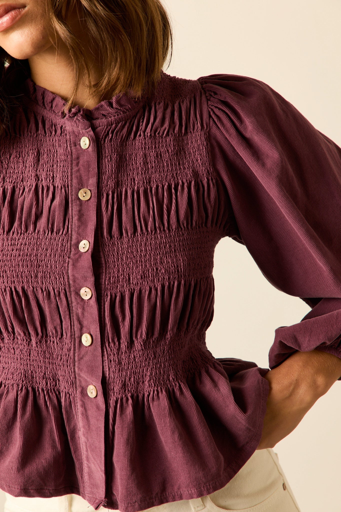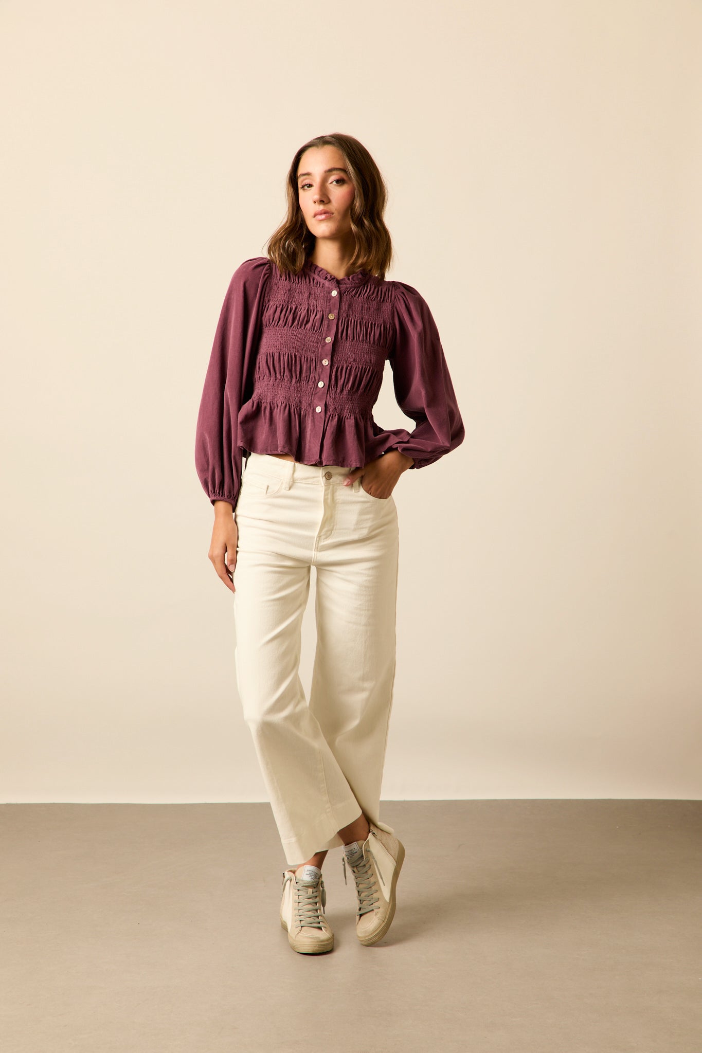 Blusa de micropana en color vino. Cuello mao, manga 3/4 abullonada, pecho de nido de abeja y detalle de frunces en busto y mangas.