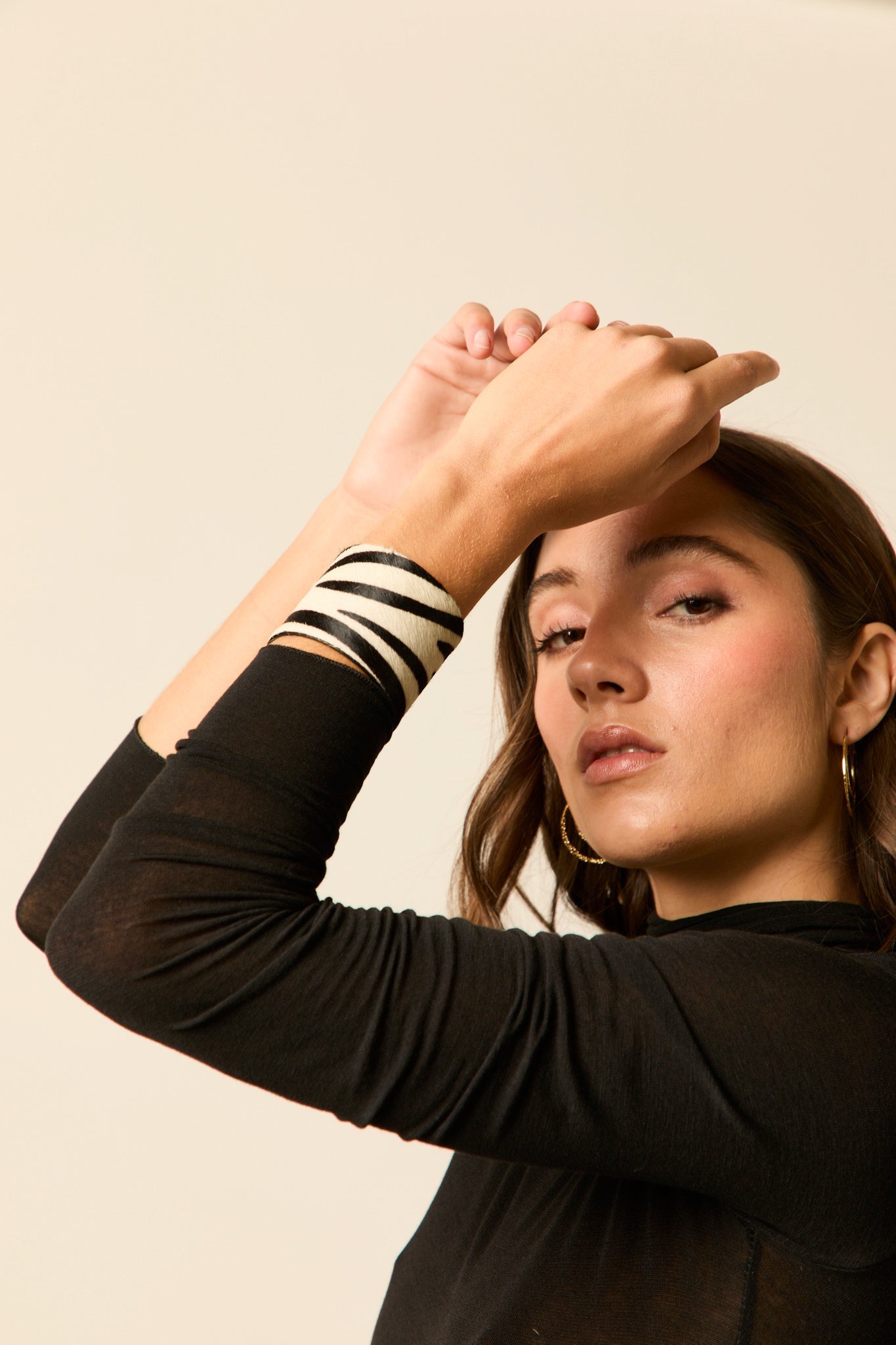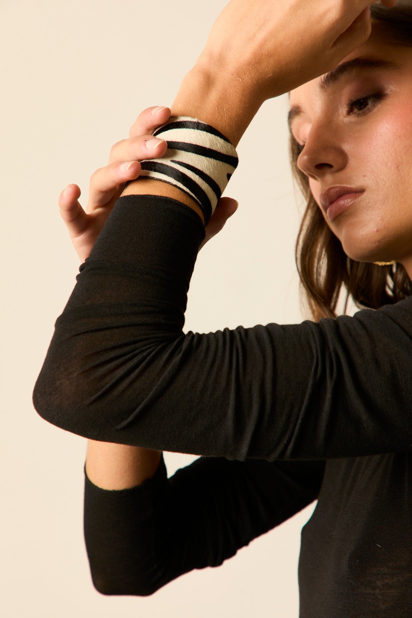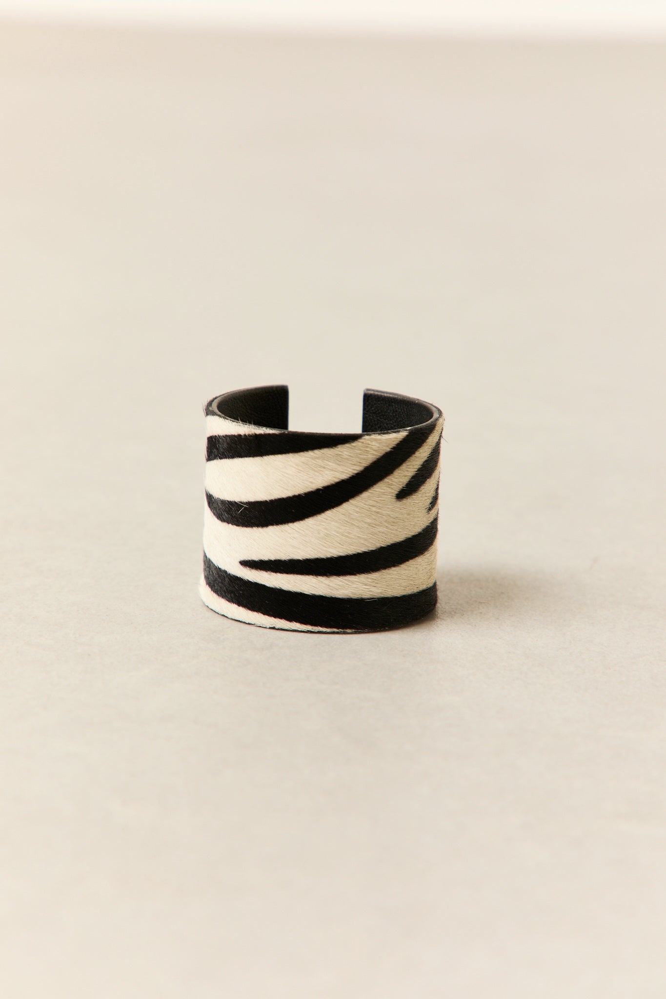 Brazalete ancho con diseño de estampado animal en acabado tipo pelaje. Su estructura es rígida y abierta, se ajusta cómodamente a la muñeca. El interior tiene un revestimiento liso en tono negro, que contrasta con el diseño exterior.