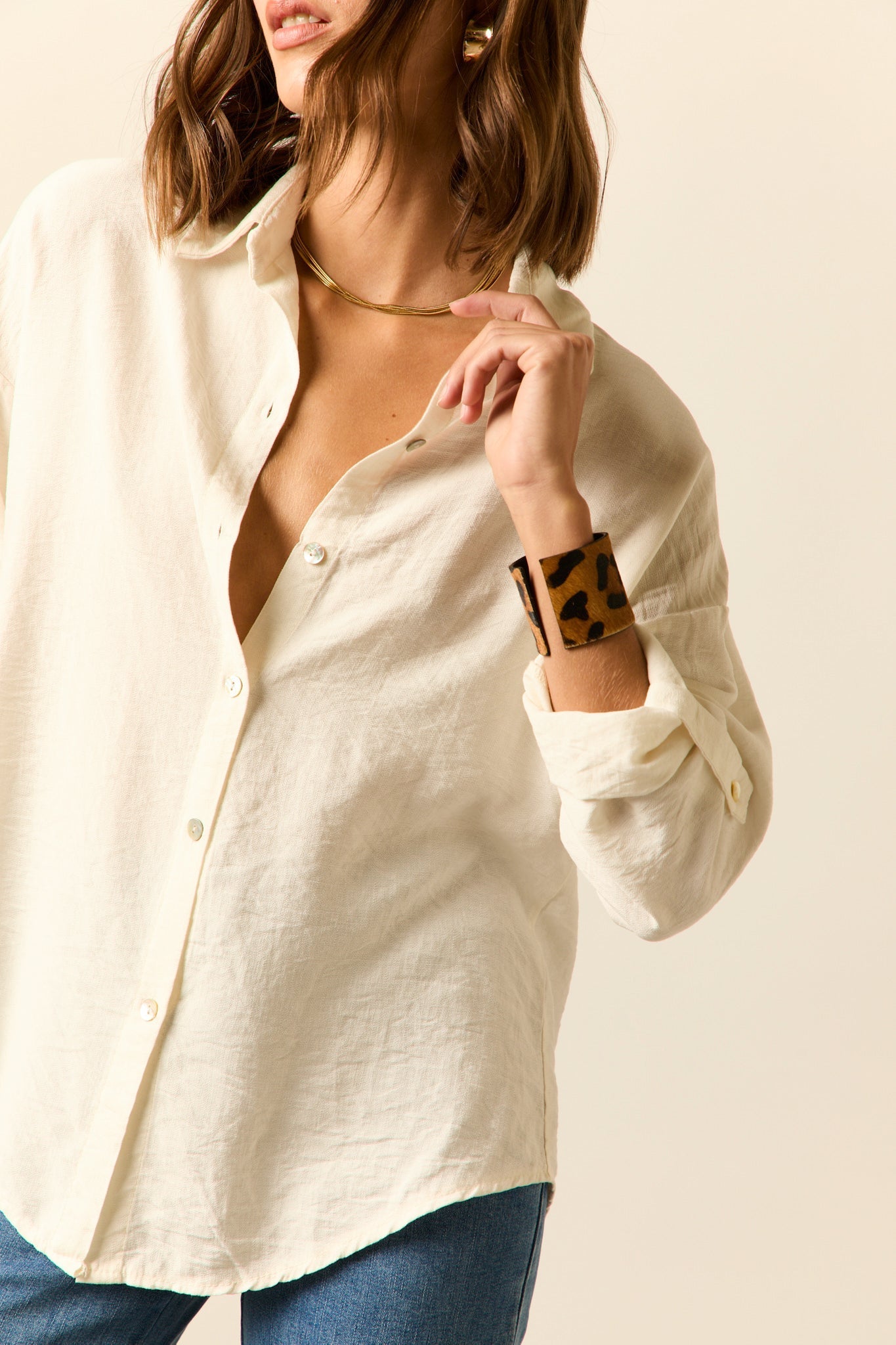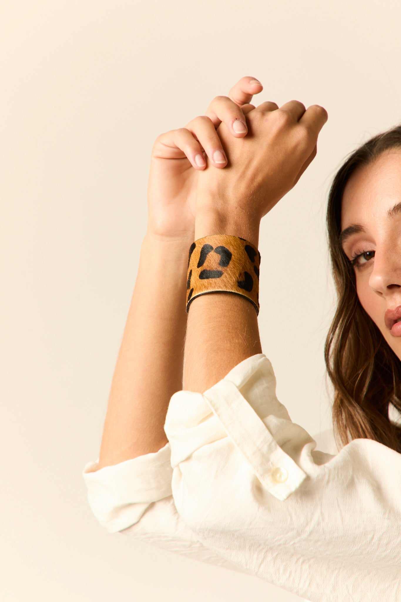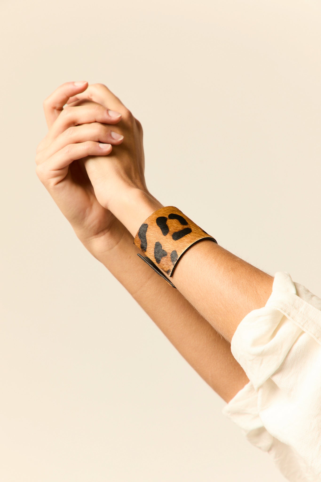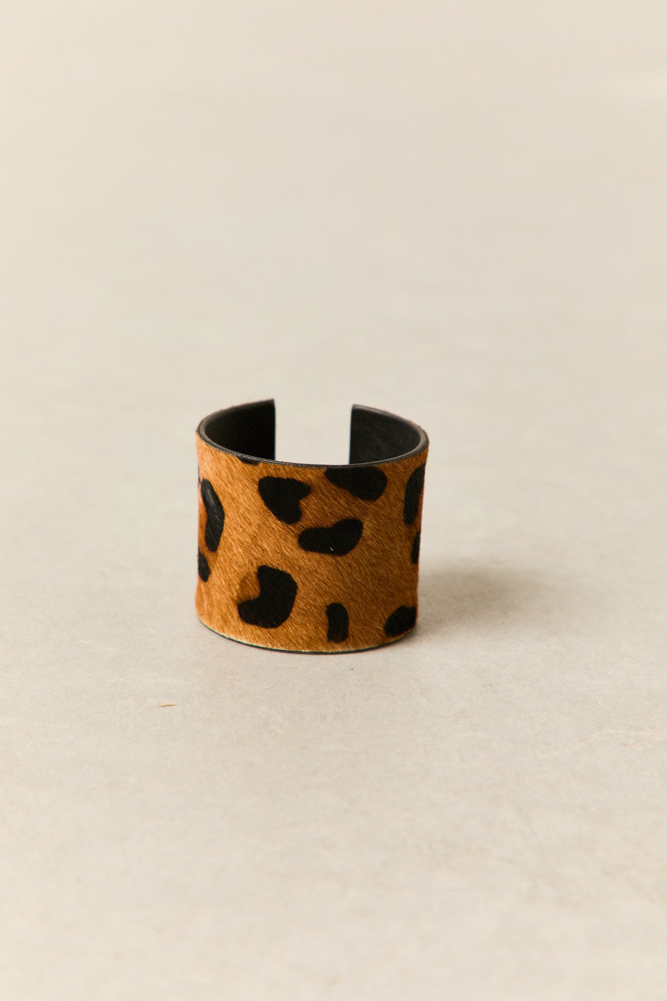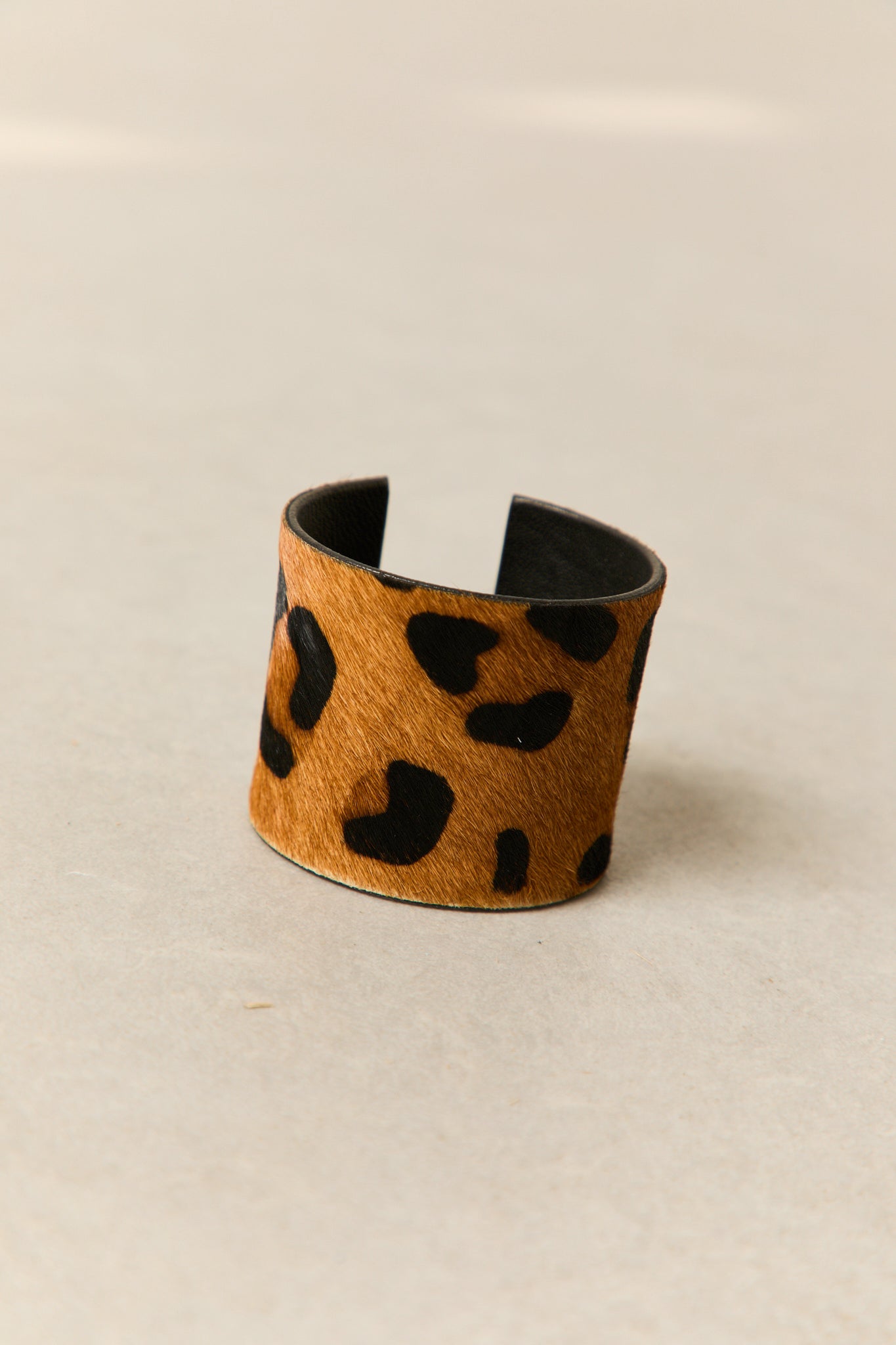 Brazalete ancho con diseño de estampado animal en acabado tipo pelaje. Su estructura es rígida y abierta, se ajusta cómodamente a la muñeca. El interior tiene un revestimiento liso en tono negro, que contrasta con el diseño exterior.