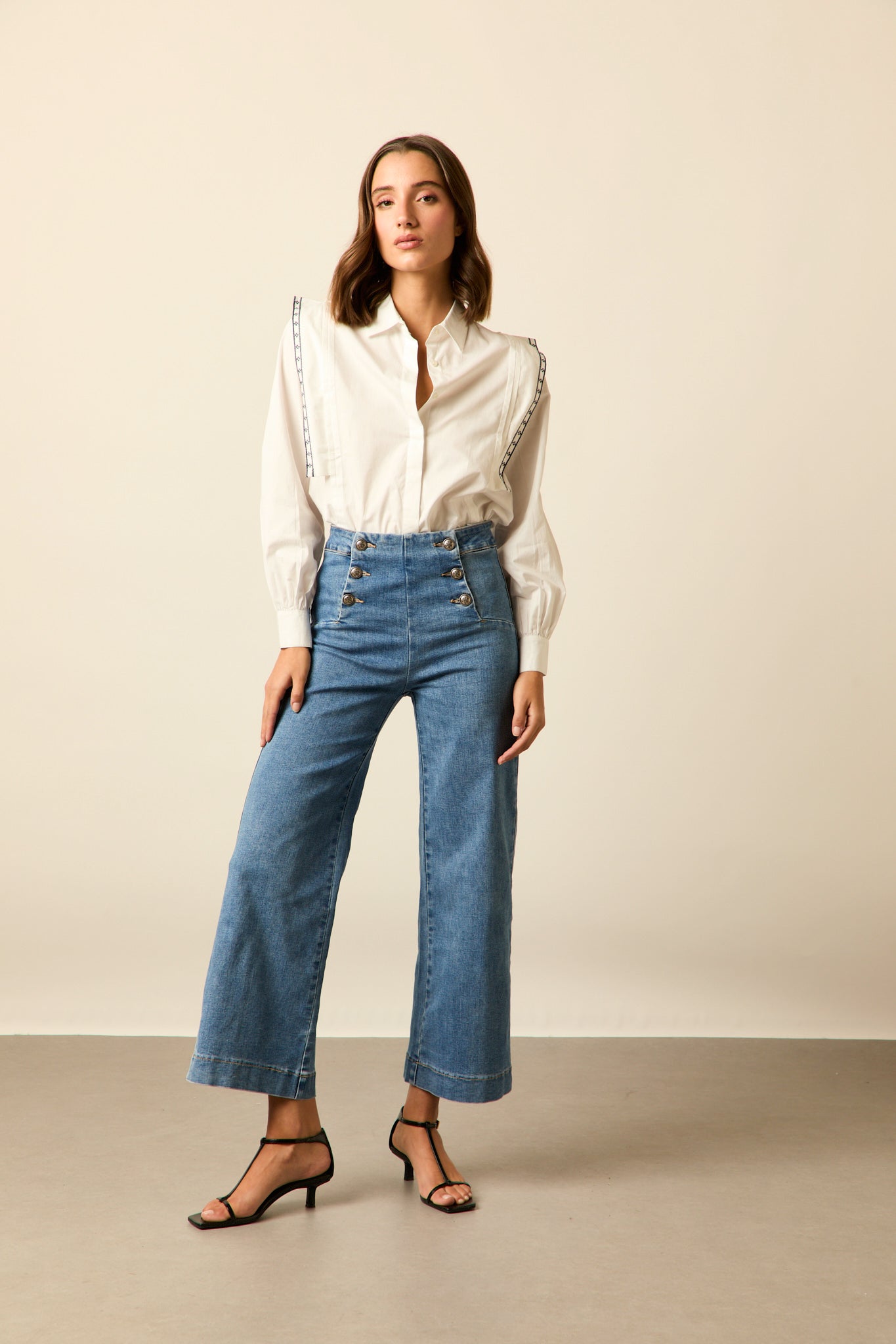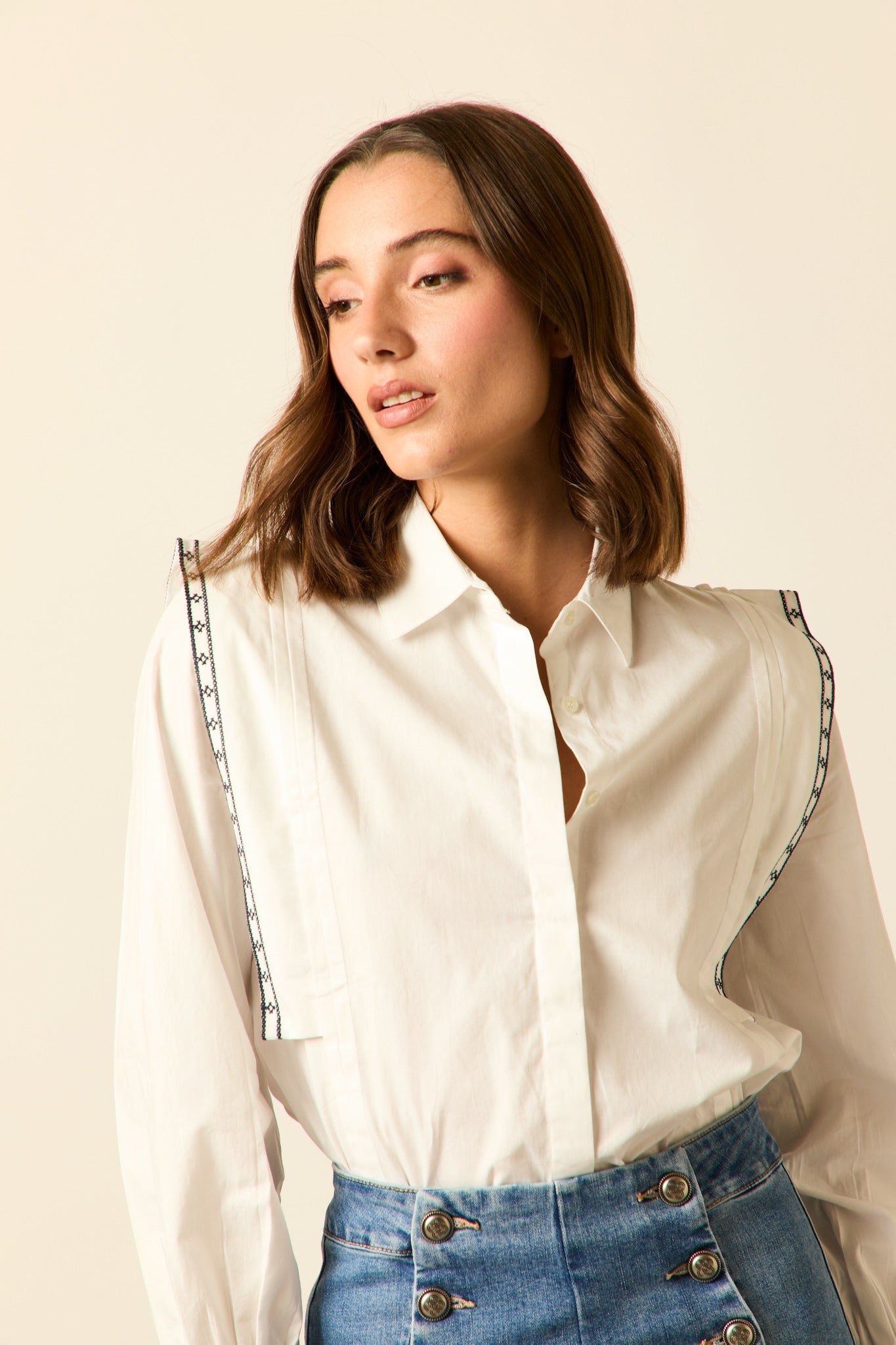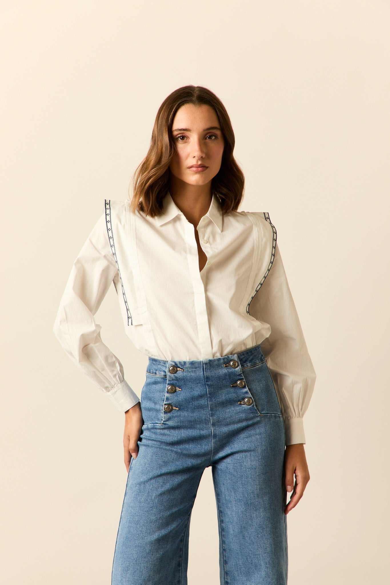 Camisa básica de popelina en tono blanco con diseño estructurado. Presenta detalle de aplicaciones decorativas en contraste a lo largo de los hombros, creando un efecto de volumen destacado. De corte recto, con cuello clásico, abotonadura frontal y mangas largas con puños ajustados.