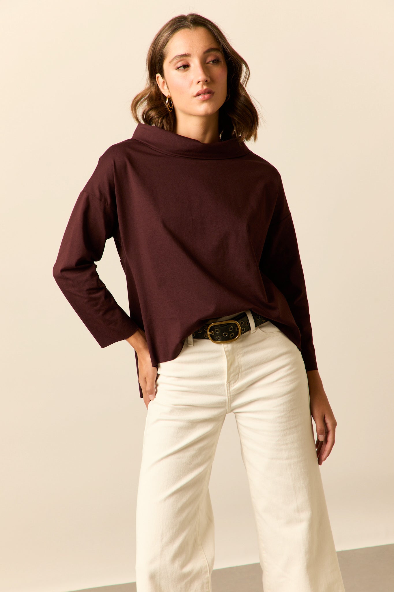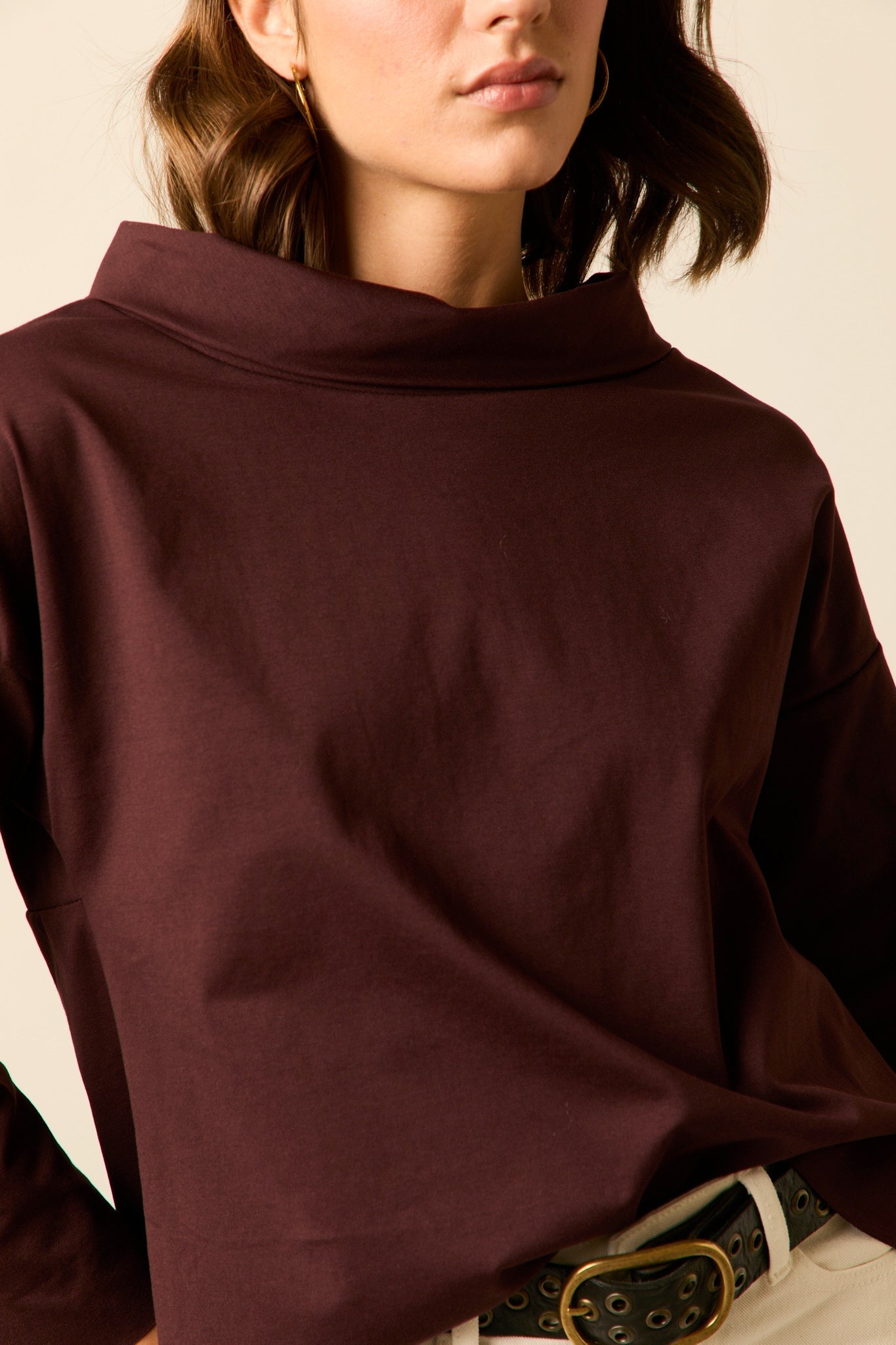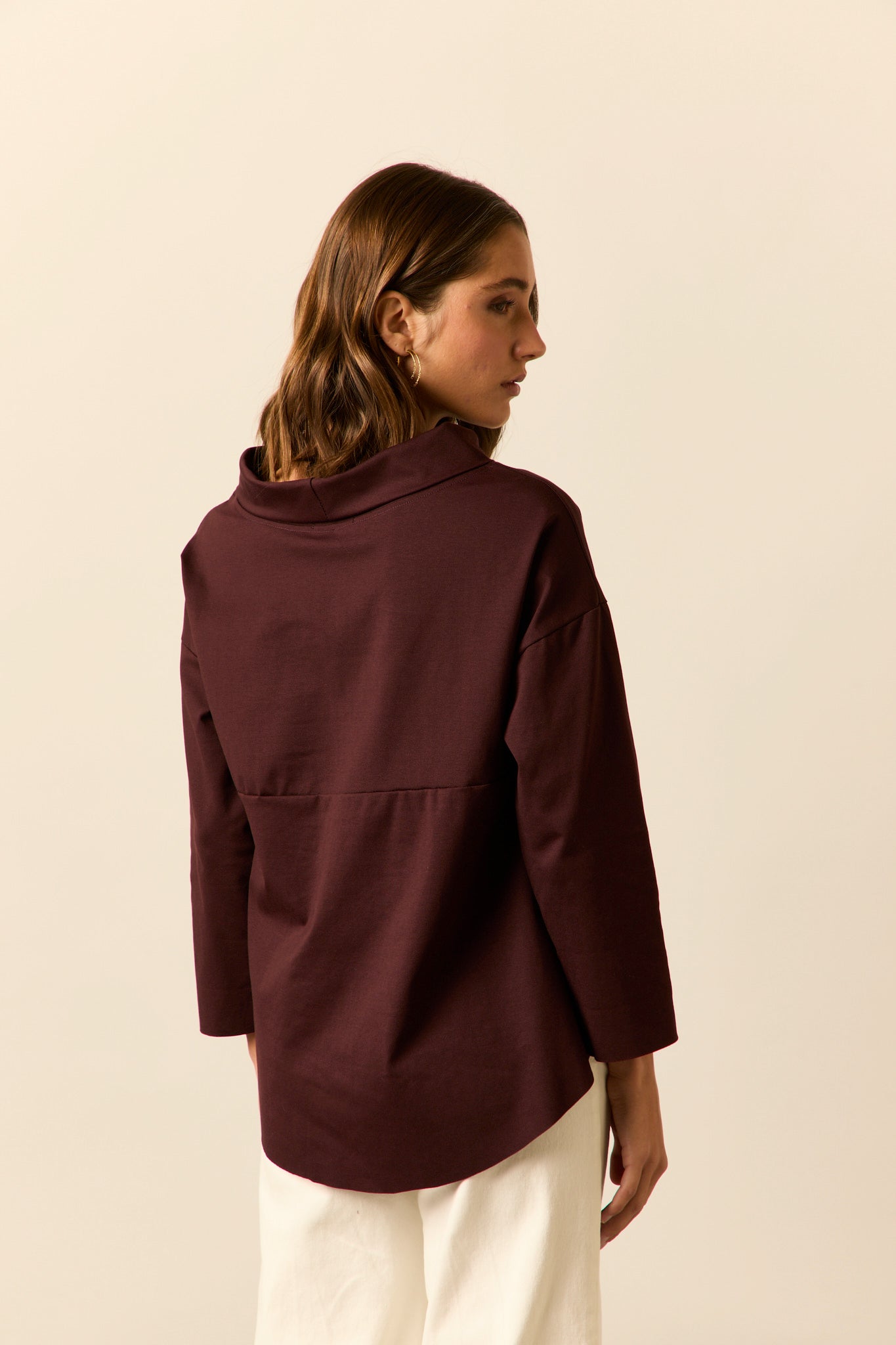 Camiseta ancha en color granate oscuro. Cuello jacqueline, manga larga y diseño fluido y asimétrico.