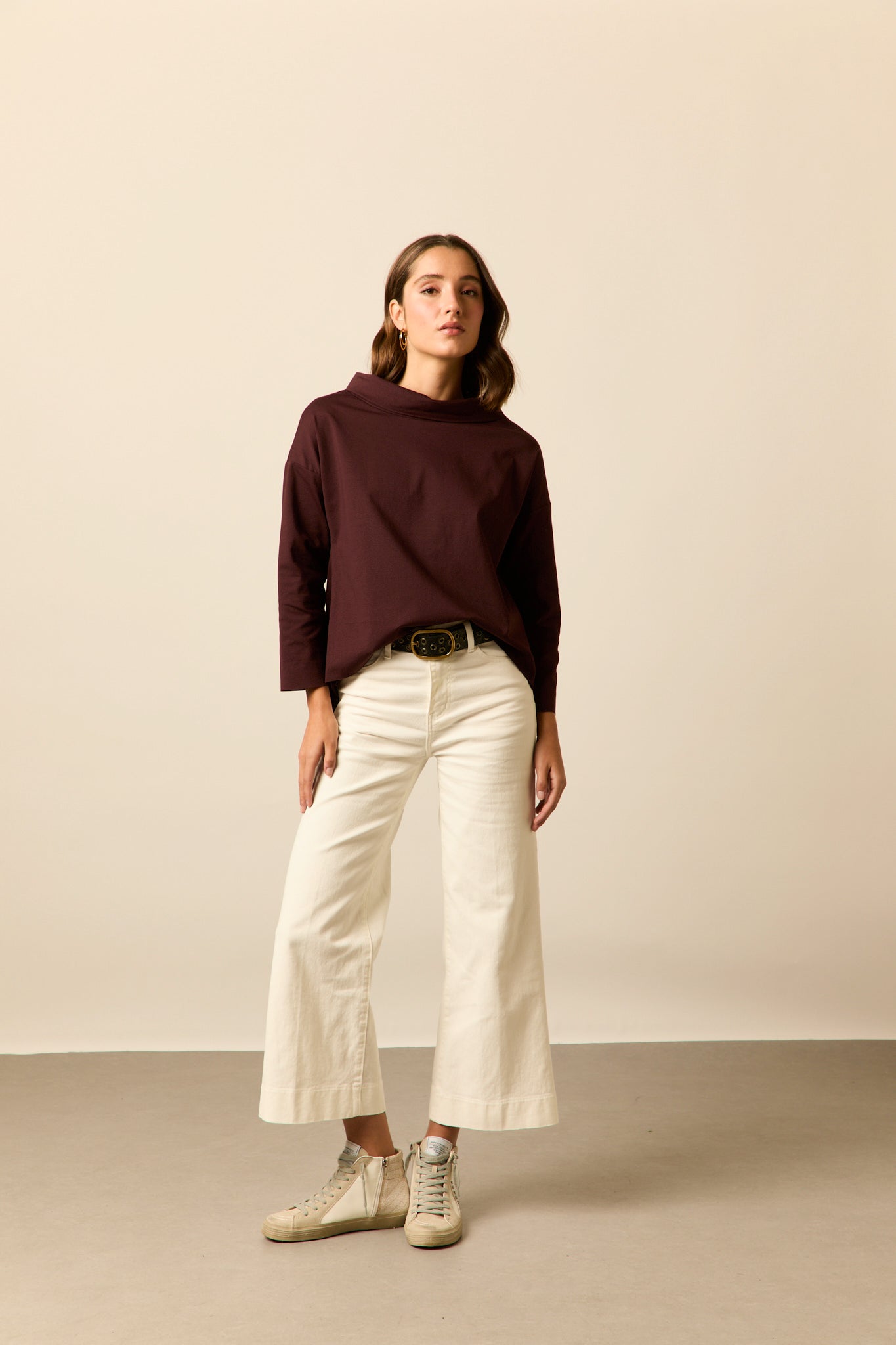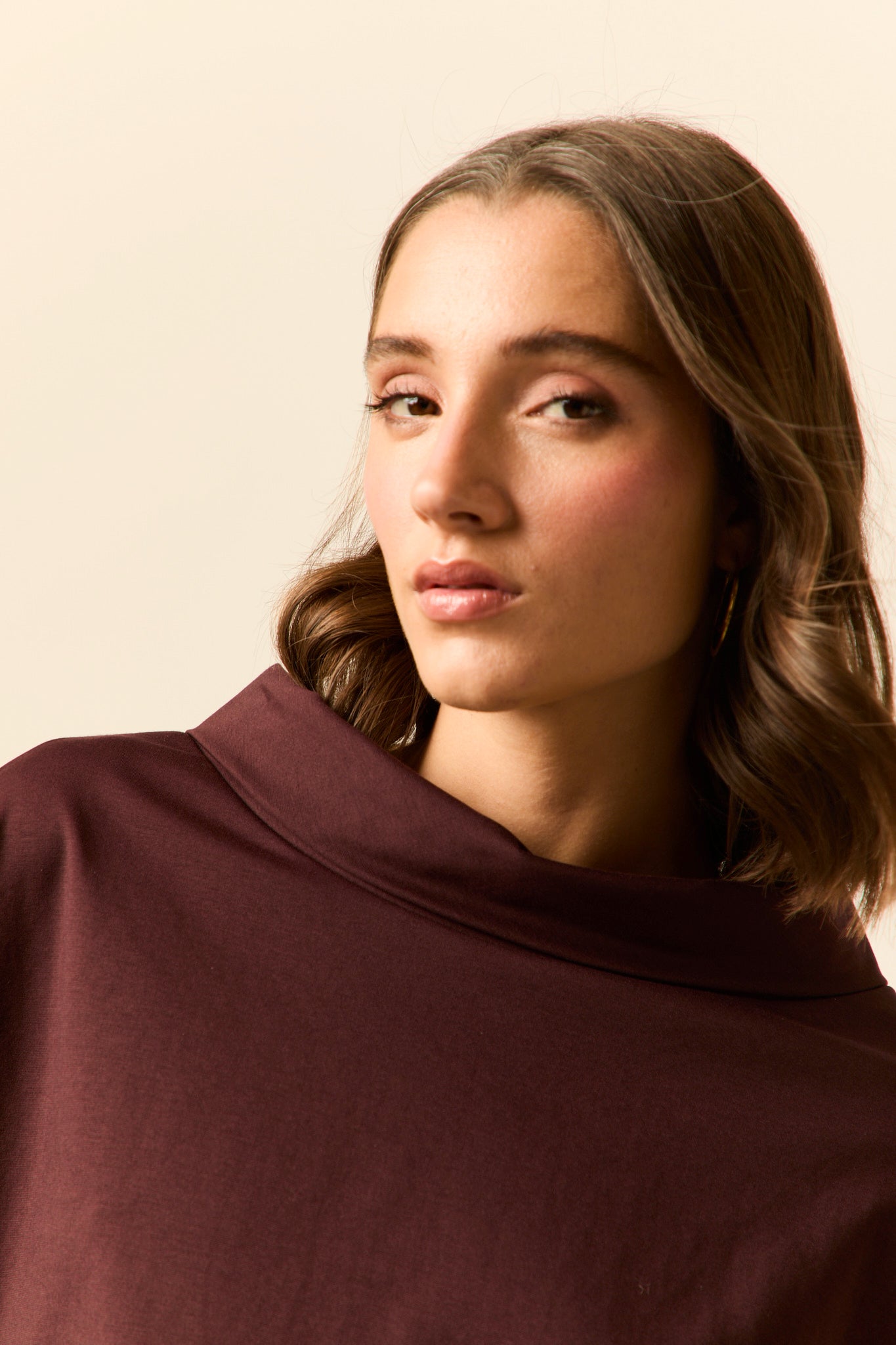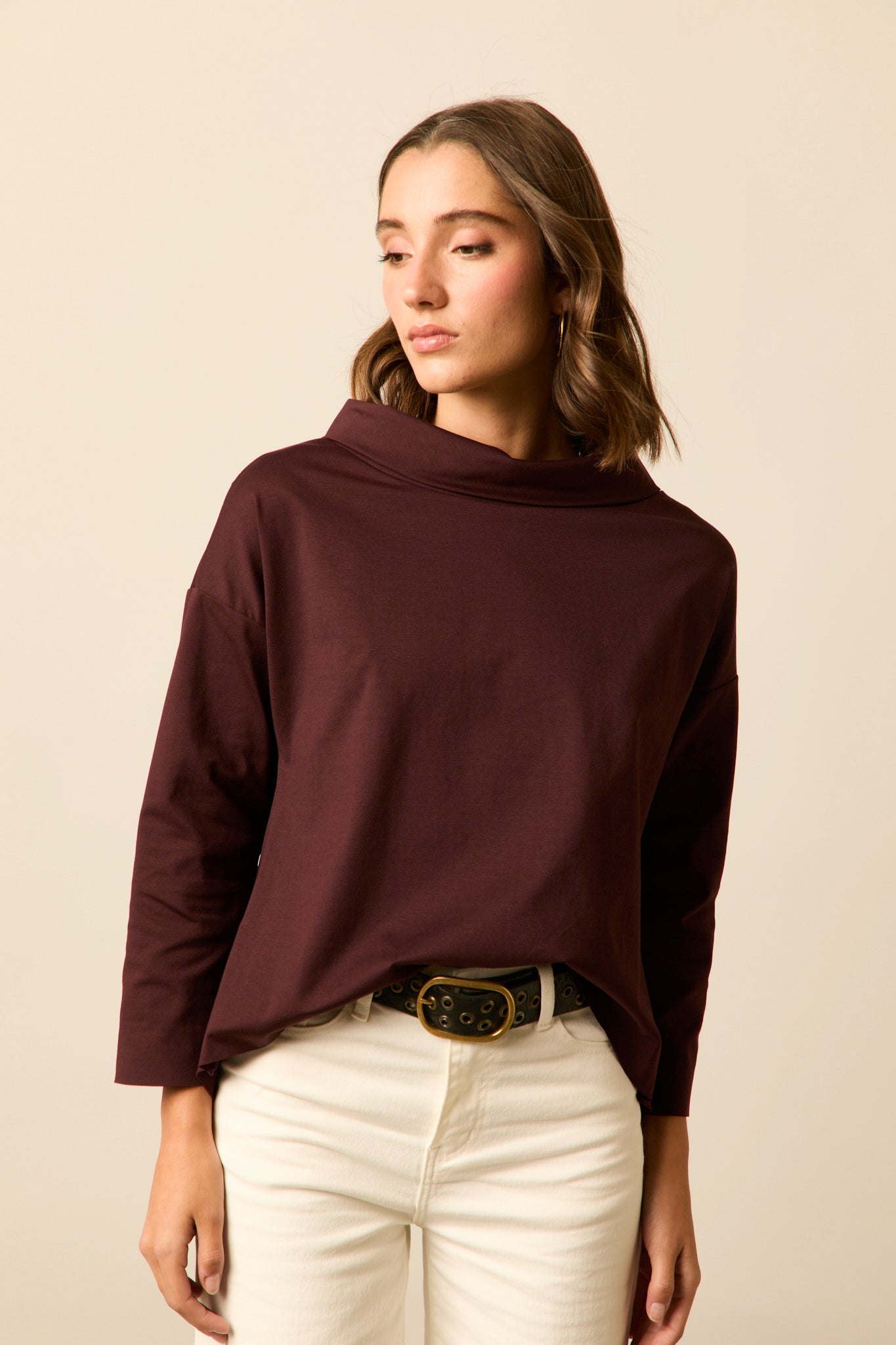 Camiseta ancha en color granate oscuro. Cuello jacqueline, manga larga y diseño fluido y asimétrico.