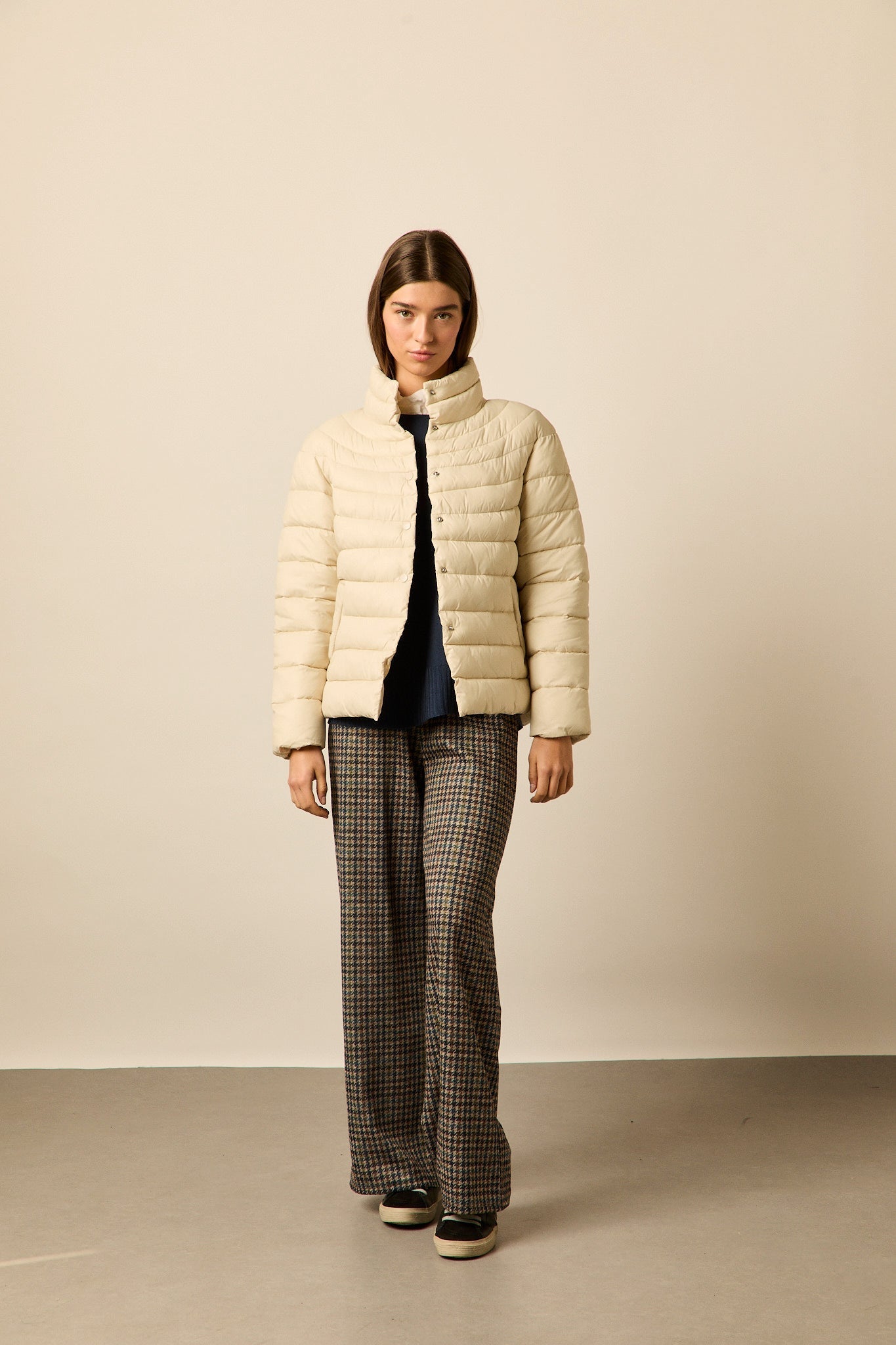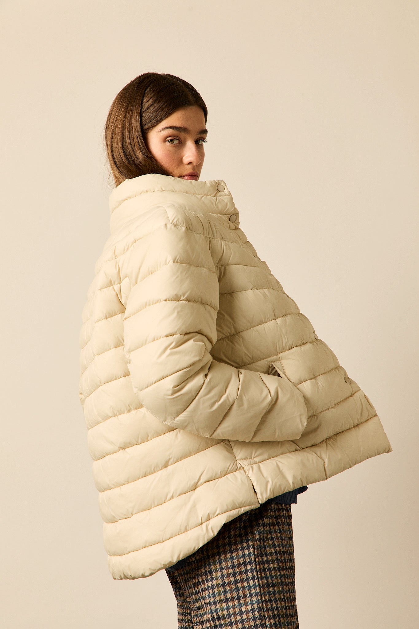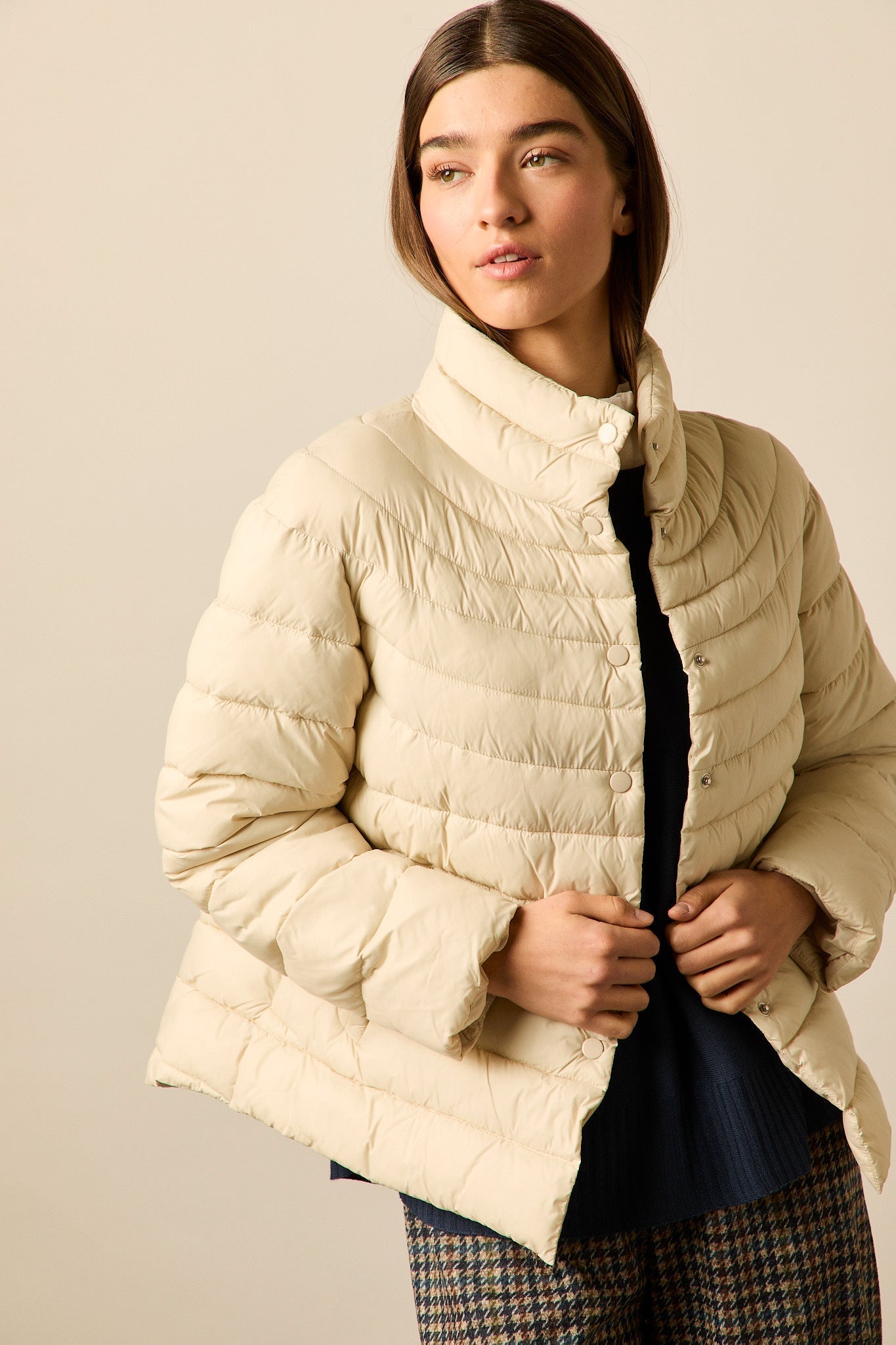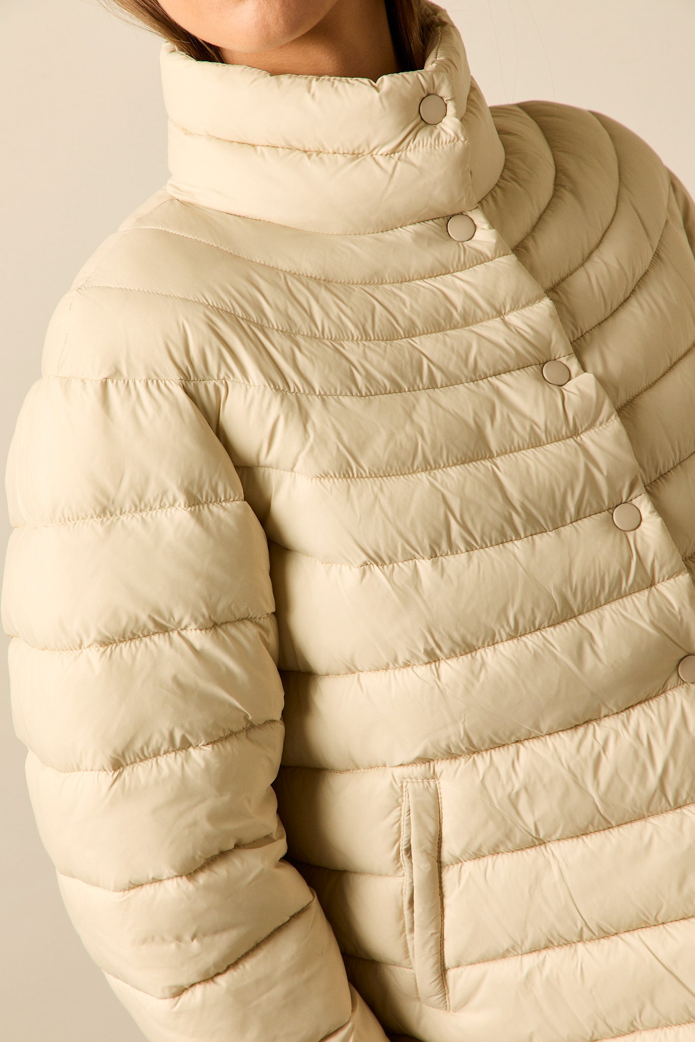 Plumífero en tono beige claro con diseño de franjas horizontales. Corte recto, cuello alto envolvente y cierre frontal con botones a presión. Manga larga y bolsillos laterales integrados.