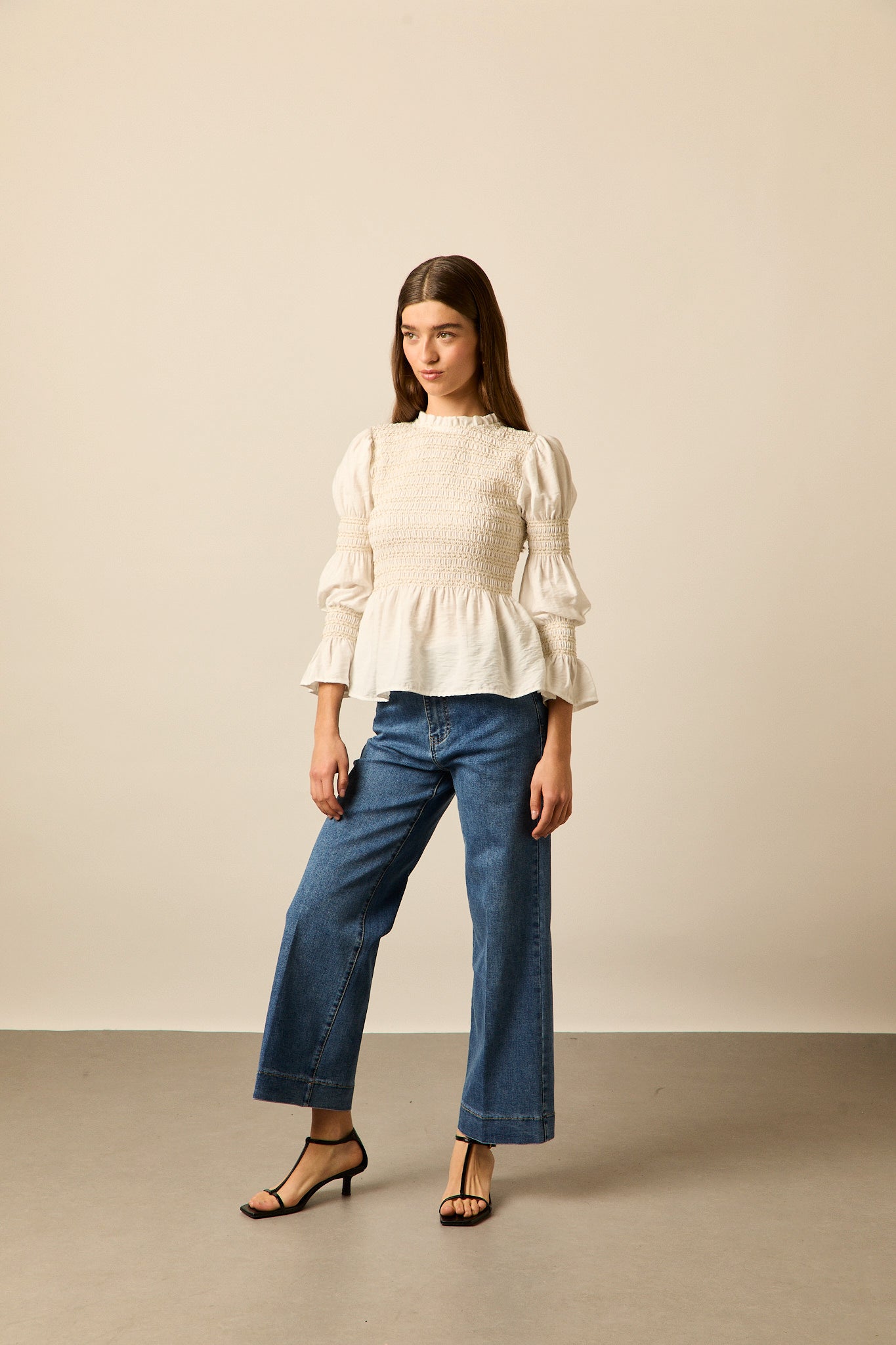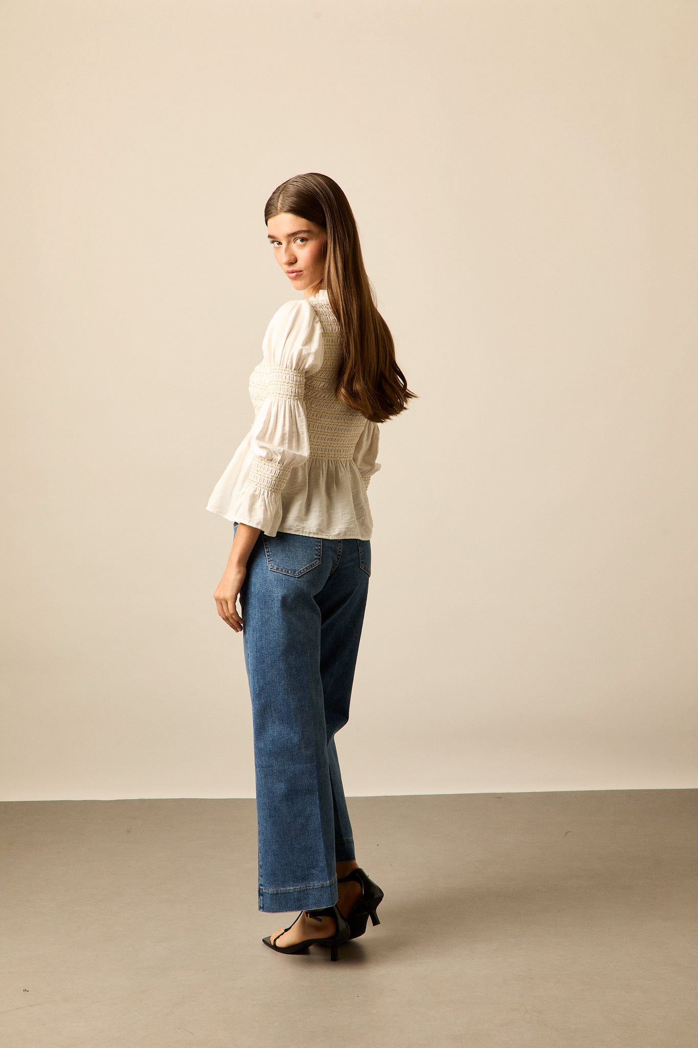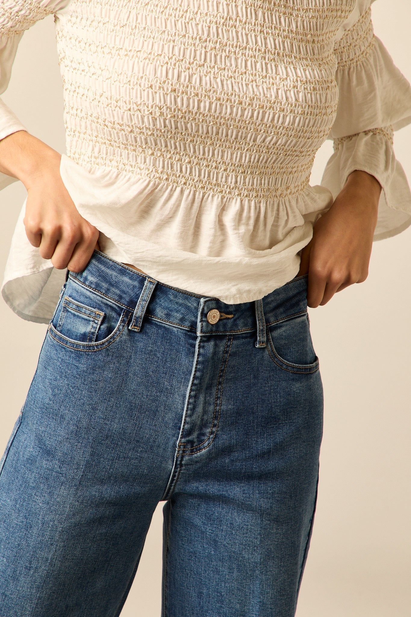 Jeans de en mezclilla de tono azul medio. Presentan un diseño de pierna recta con un ligero corte evasé. Cuentan con bolsillos traseros de parche y bolsillos delanteros clásicos, además de costuras en contraste que resaltan la estructura de la prenda. El cierre es mediante botón metálico y cremallera oculta.